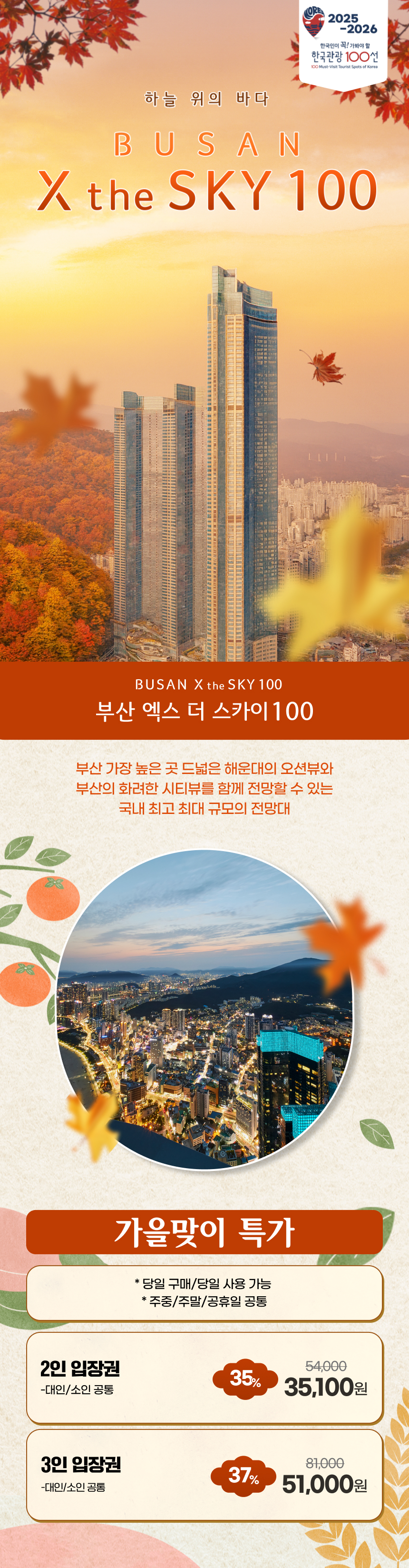 🎉엑스더스카이 가을맞이 패밀리 특가🎉 가을맞이 최대 37% 할인된 금액으로 부산의 대표 명소인 엑스더스카이를 방문해 보세요! 판매기간: 2025.10.01 ~ 2025.10.12 사용기간: ~2025.11.30