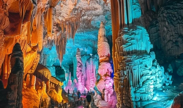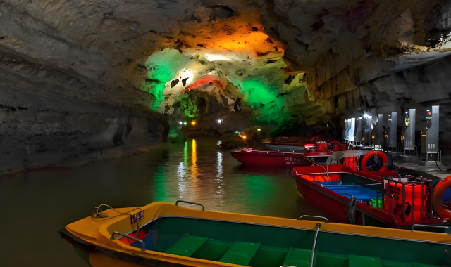 황룡동굴은 중국 10대 용암동굴 중 하나예요. 4층 구조에 걸쳐 종유기둥 길이만 총 14,000m에 달한답니다. 동굴 깊숙한 곳을 흐르는 지하수 위에서 보트를 타며 경이로운 자연 경관을 만나보세요!