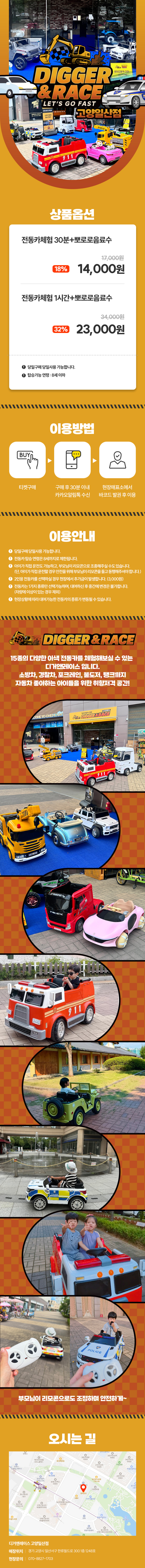 MMS 즉시 제공디거앤레이스는 아이들이 좋아하는 전동카를 마음껏 즐길 수 있는 특별한 공간이에요! 무려 15종의 다양한 이색 전동카가 준비되어 있어 소방차, 경찰차, 포크레인, 불도저, 탱크까지 아이들의 호기심을 한껏 자극해요. 특히 아이가 직접 운전도 하면서, 부모님이 리모컨으로 직접 조정할 수 있어 안전하게 체험할 수 있어 가족 모두가 안심하고 즐길 수 있는 취향저격 플레이존이랍니다.