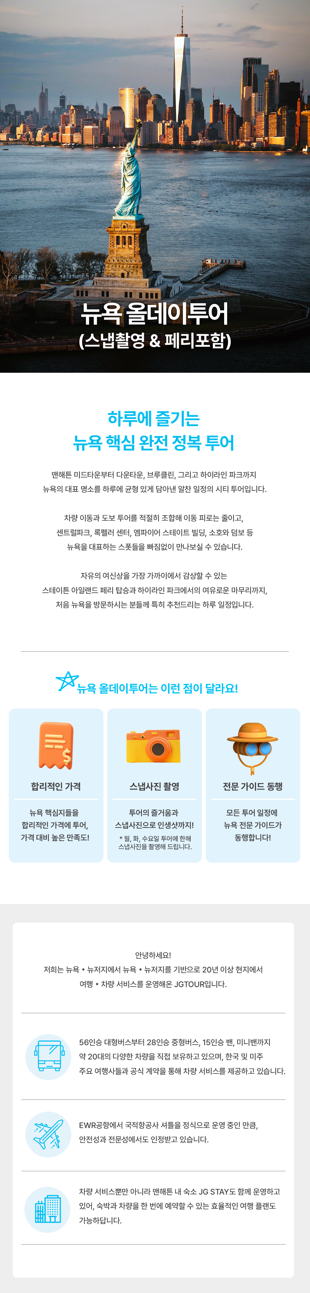 단 9시간의 투어로 뉴욕의 하이라이트를 모두 경험할 수 있어 짧은 일정의 여행객에게 특히 추천해요. 전문 한국어 가이드의 재미있는 설명과 함께 뉴욕의 진정한 매력을 느껴보세요. 제이지버스투어에서 제공하는 뉴욕 시내 하이라이트 당일 투어 상품이에요. 약 9시간 동안 전용 차량을 타고 맨해튼의 주요 명소들을 방문해요. 자유의 여신상을 가까이서 볼 수 있는 페리 티켓이 포함되어 있어 더욱 알찬 여행을 즐길 수 있어요. 운전, 주차, 길 찾기는 투어팀에 맡기고 편안하게 뉴욕 여행에만 집중해 보세요.