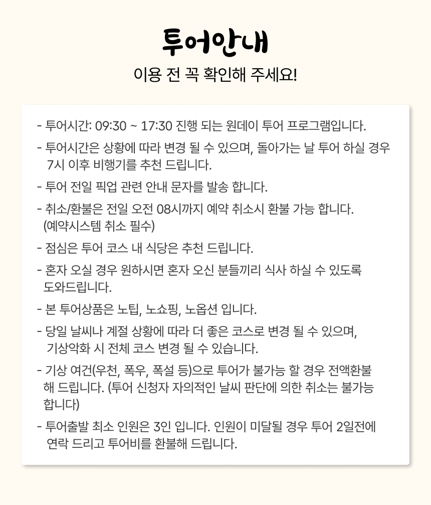 투어시간 : 오전 09:30 ~ 오후 17:30 진행