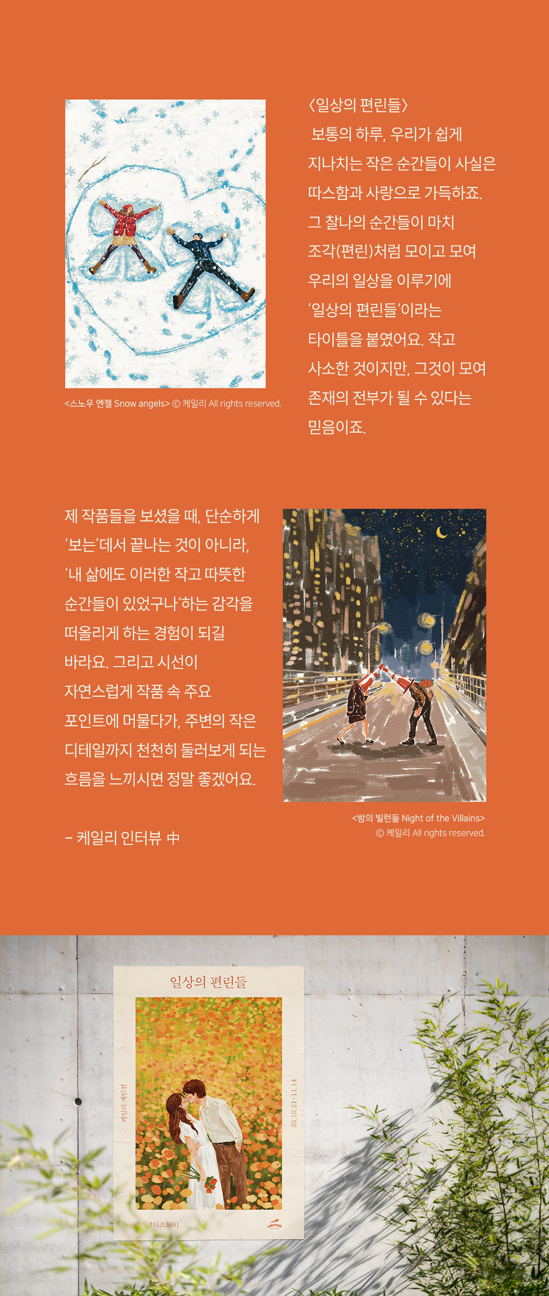 이번 전시는 단순히 그림을 감상하는 것을 넘어, 내가 살아가는 매일의 풍경을 새롭게 바라보게 만들어줘요. 바쁜 하루 속에 잊고 있던 작은 행복을 다시 발견하고, 일상이 예술이 될 수 있다는 걸 느끼게 해주죠. <일상의 편린들>은 지친 일상 속 따뜻한 위로와 소소한 기쁨을 선물하는 시간이 될 거예요!