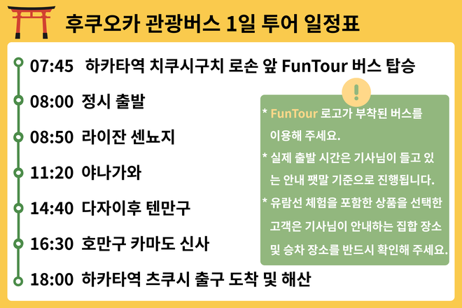 또한 편리한 승·하차 지점이 마련되어 있어, 일정이 끝난 후에도 자유롭게 후쿠오카 시내 관광을 이어갈 수 있어요. 하루 동안 알차게 떠나는 후쿠오카 근교 투어로 특별한 추억을 만들어 보세요!