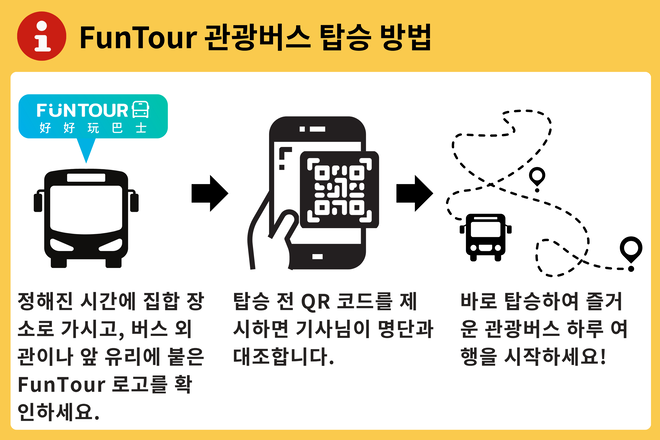 * 버스 차체 앞 또는 유리창의 FunTour 표식을 확인하시고, 기사님께 QR 코드를 제시해 예약 정보를 확인해 주세요.