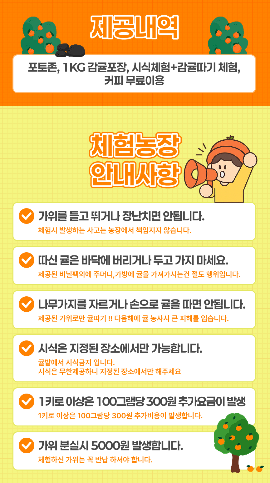 싱그러운 향이 가득한 품질 좋은 감귤 농장에서 직접 감귤을 따며 무료 시식 체험까지 즐길 수 있어요! 감귤 하나하나의 달콤함을 맛보며 1kg 포장해서 감귤을 집으로 가져갈 수 있답니다. 넓은 감귤밭 곳곳에는 감성 가득한 포토존이 마련되어 있어 인생샷을 남기기에 딱 좋아요. 또한 무료 커피 제공으로 향긋한 커피 한 잔과 함께 여유로운 제주 감귤의 오후를 즐길 수 있습니다.