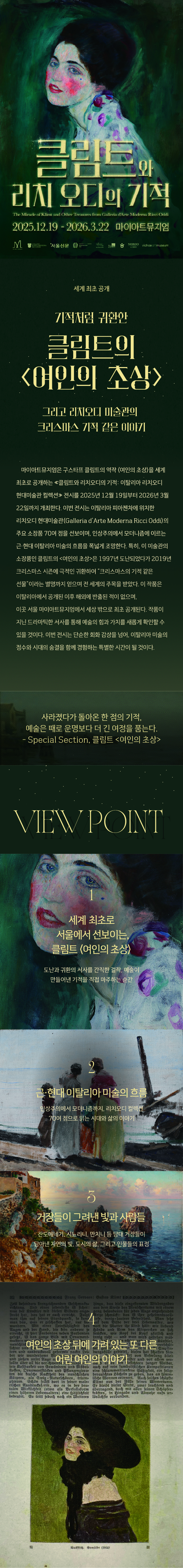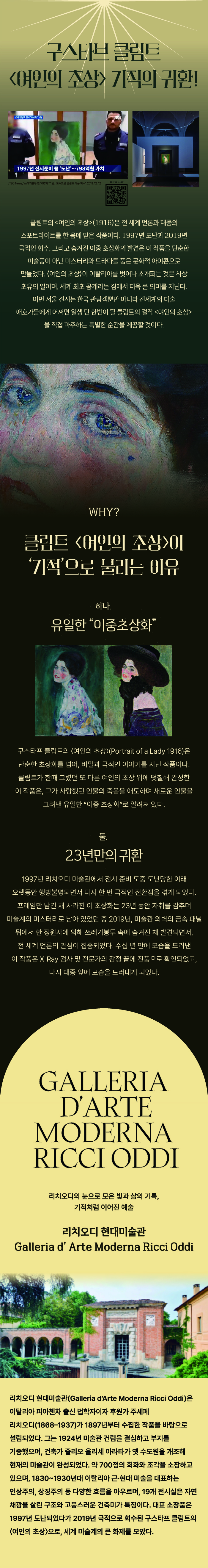 이번 전시는 이탈리아 피아첸차 리치오디 현대미술관의 주요 소장품 70여 점을 통해 인상주의에서 모더리즘에 이르는 근·현대 이탈리아 미술의 흐름을 폭넓게 조망합니다. 특히 1997년 도난되었다가 2019년 크리스마스 시즌에 극적으로 귀환한 클림트의 <여인의 초상>은 ‘크리스마스의 기적 같은 선물’로 불리며 전 세계의 주목을 받은 작품이에요. 이 작품은 이탈리아 외 지역에서는 단 한 번도 공개된 적이 없으며, 이번 전시를 통해 서울에서 처음으로 세상 밖으로 모습을 드러냅니다.
