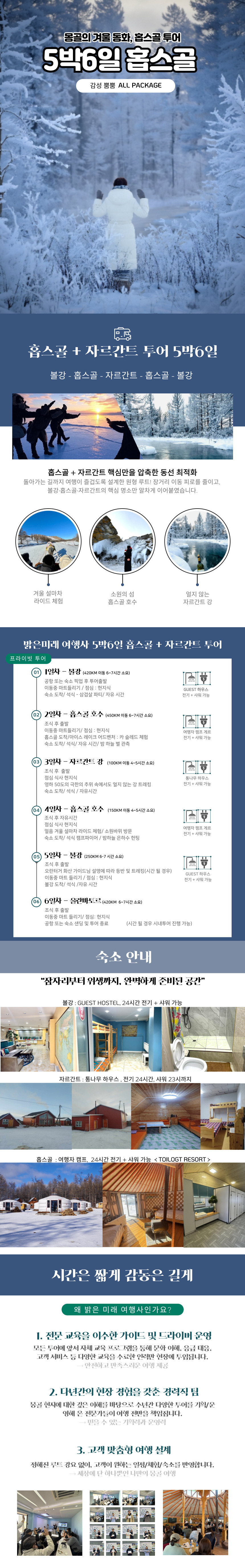 이 여행은 몽골의 푸른 진주라 불리는 '홉스골' 호수와 몸을 녹여주는 따뜻한 '자르간트' 온천을 핵심 코스로 방문해요.