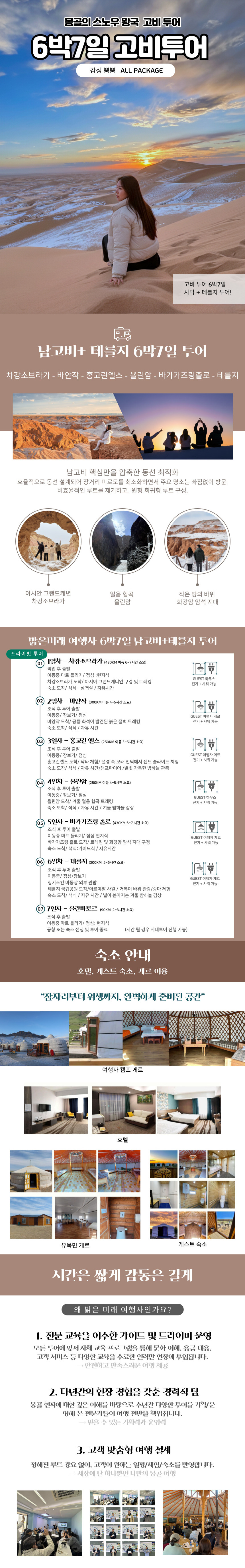 몽골 남부와 중부의 대표 명소를 모두 둘러볼 수 있는 6박 7일 남고비·테를지 올패키지 투어를 소개해요.