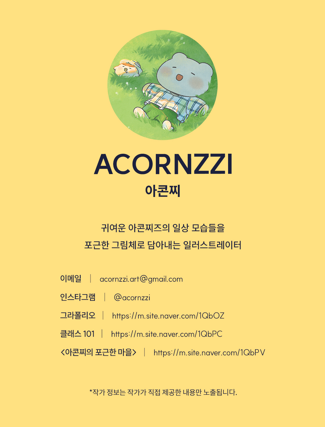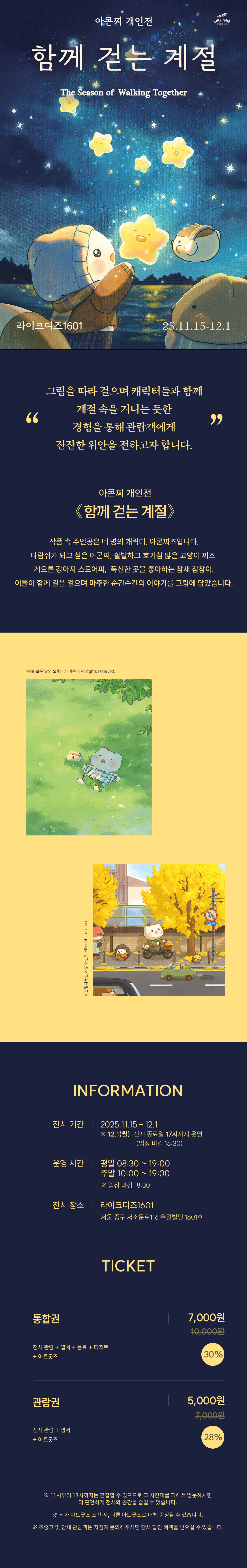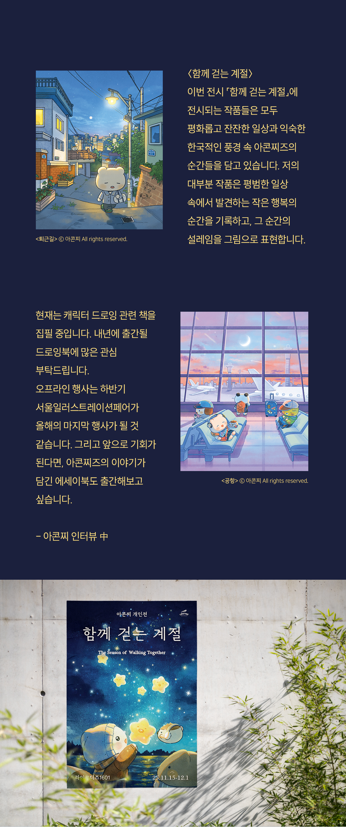 이번 전시 <함께 걷는 계절>은 사계절의 흐름 속 평화로운 풍경과 잔잔한 일상을 아콘찌즈만의 따뜻한 감성으로 담아낸 전시에요. 그림을 따라 걸으며 캐릭터들과 계절 속을 함께 거니는 듯한 경험은 관람객에게 잔잔한 위안을 전한답니다. 푸른 바람이 스며드는 초여름, 고요하고 따뜻한 가을, 차분한 겨울의 포근한 공기까지—작가는 계절의 작은 결들을 작품 속에 녹여내어 소소한 하루의 순간들을 특별한 기억으로 남길 수 있도록 표현했어요. 작품 속 주인공은 네 명의 캐릭터, 아콘찌즈랍니다. 🌰 다람쥐가 되고 싶은 ‘아콘찌’, 🐱 활발하고 호기심 많은 고양이 ‘찌즈’, 🐶 게으른 강아지 ‘스모어피’, 🐦 푹신한 곳을 좋아하는 참새 ‘참참이’. 이들이 함께 길을 걸으며 마주한 순간순간의 이야기가 그림 속에 담겨 있어요.