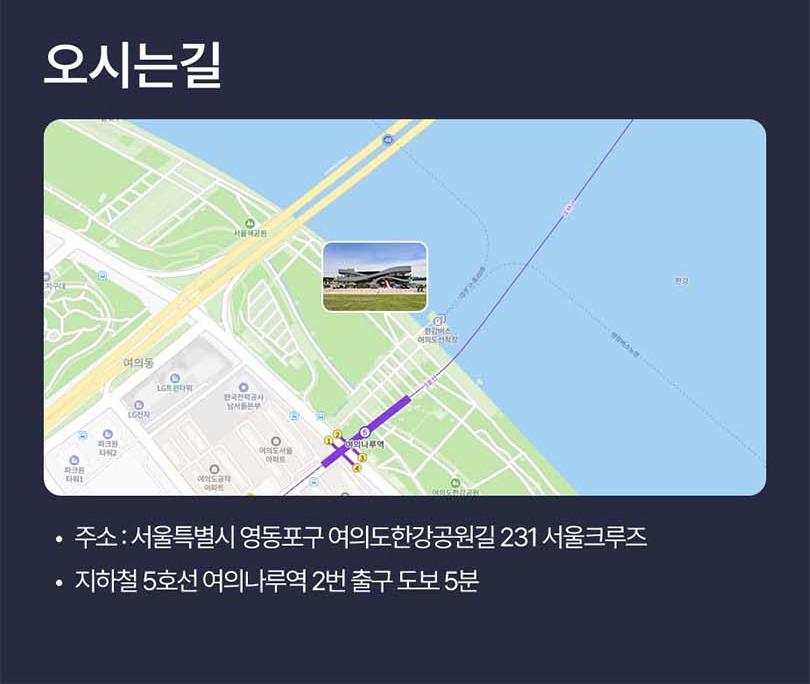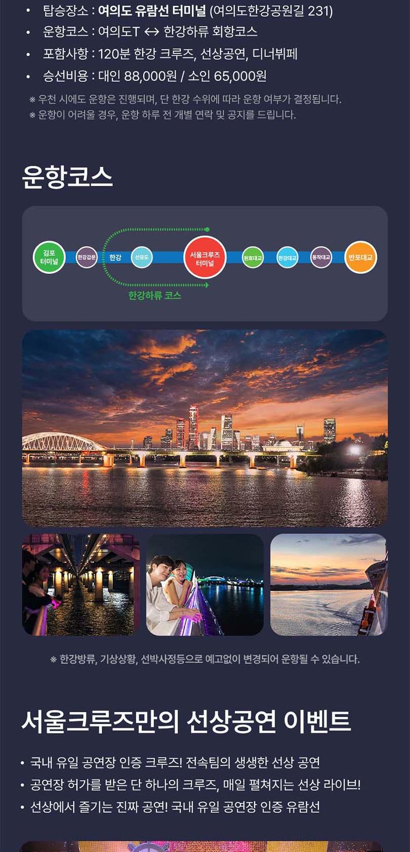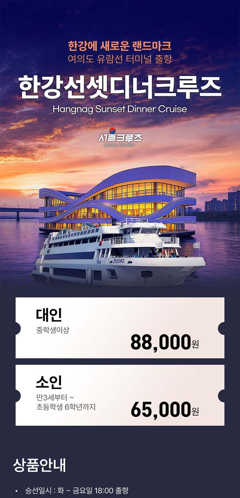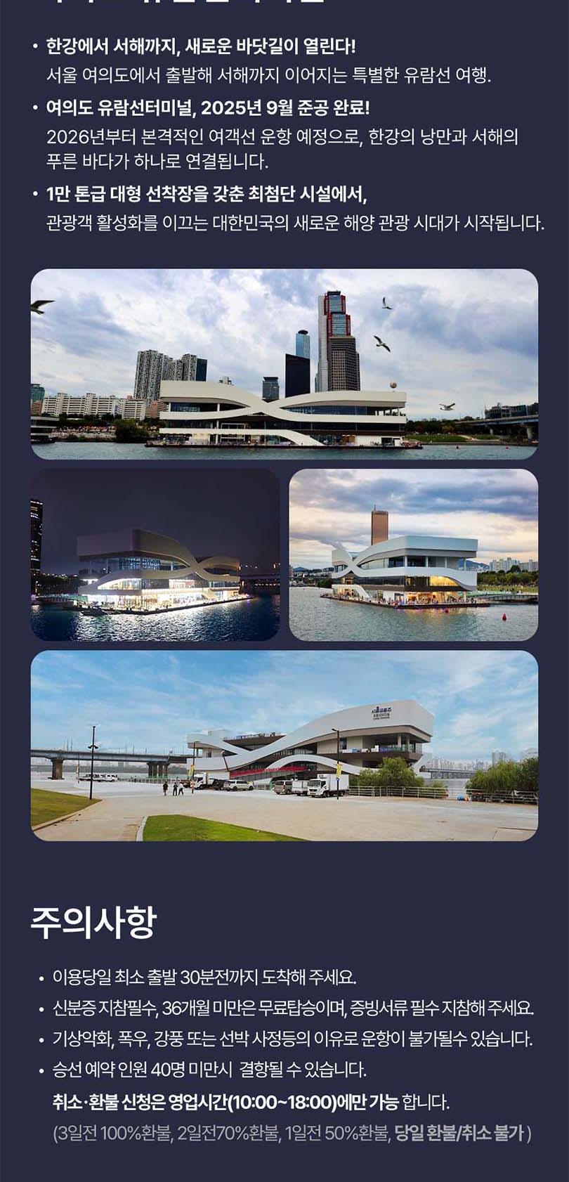 이 크루즈는 단순히 한강 위를 도는 것이 아니라, 한강에서 서해로 이어지는 새로운 수로 문이 열렸다는 의미를 담고 있어요. 서울 여의도에서 시작해 서해까지 이어질 수 있는 특별한 항로를 가진 유람선이기에 더 의미 있고 기대되는 경험이 될 거예요. 노을과 야경, 디너와 음악이 한 번에 함께하는 저녁. 한강이 가장 아름다운 시간, 그 순간을 물 위에서 천천히 즐겨보세요. 🌇🌉✨