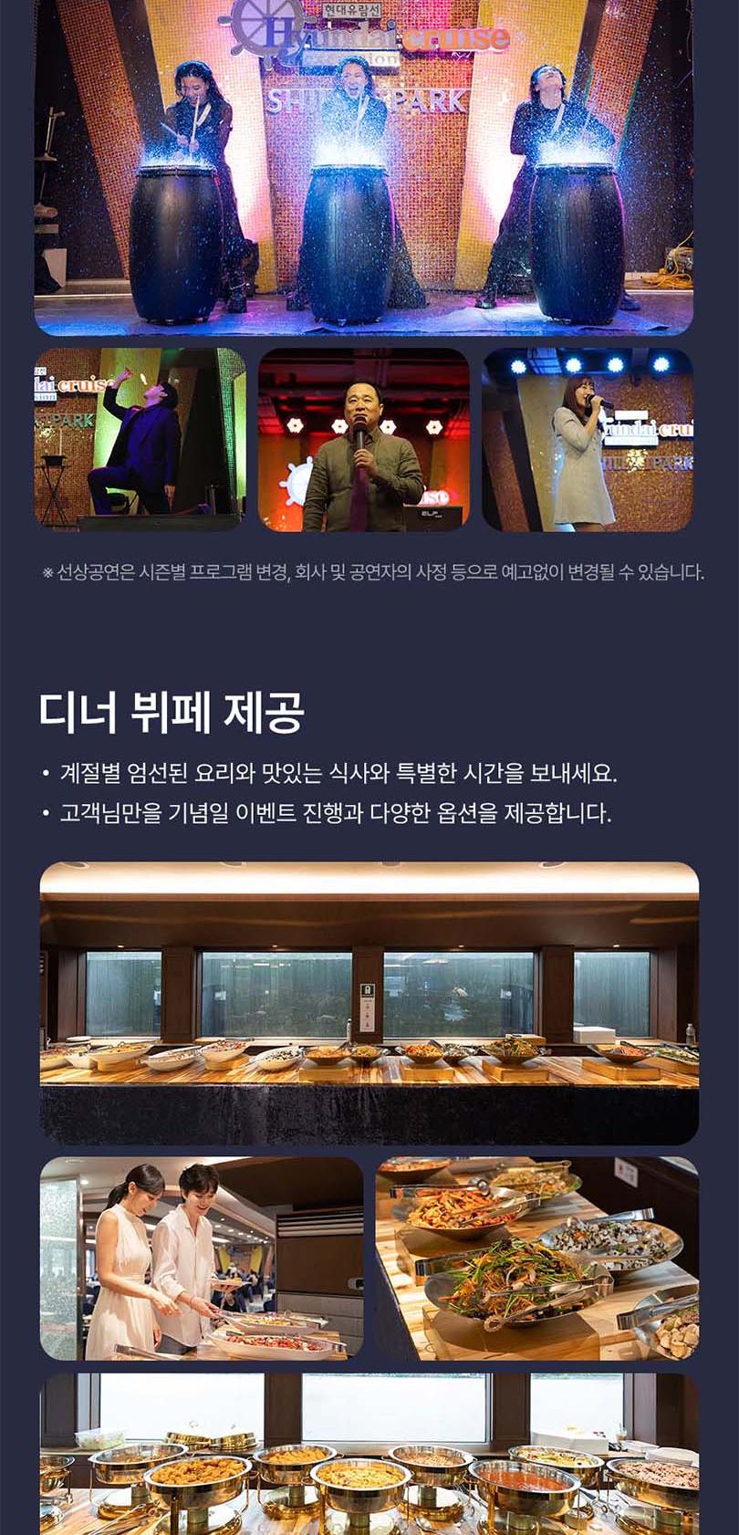 한국어 제공서울크루즈의 한강 선셋디너크루즈는 여의도 선착장에서 출발해 한강 하류를 따라 회항하는 코스예요. 해 질 무렵 한강 위를 천천히 미끄러지듯 이동하면서 도심이 황금빛으로 물드는 순간을 바라보면, 익숙한 서울이 조금은 낯설고 더 아름답게 느껴져요. 이 크루즈는 국내에서 유일하게 공연장 허가를 받은 크루즈라서 전속팀이 선상 공연을 매일 선보여요. 해가 지는 하늘과 반짝이는 도시 야경, 그리고 선상 라이브 음악이 어우러져 영화 같은 시간이 펼쳐져요.