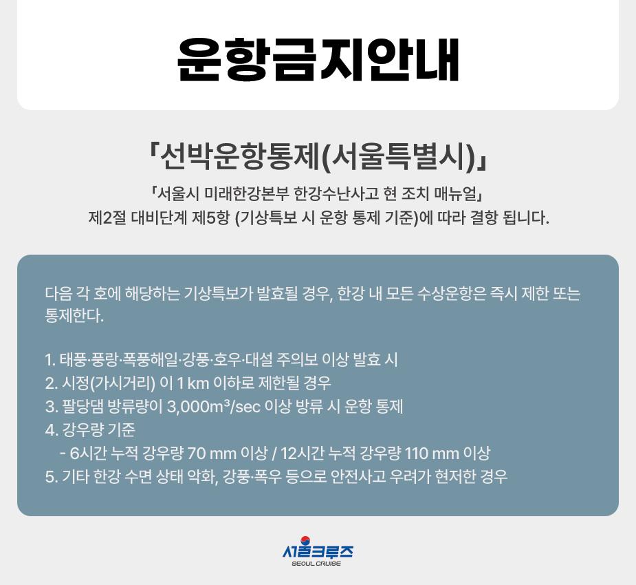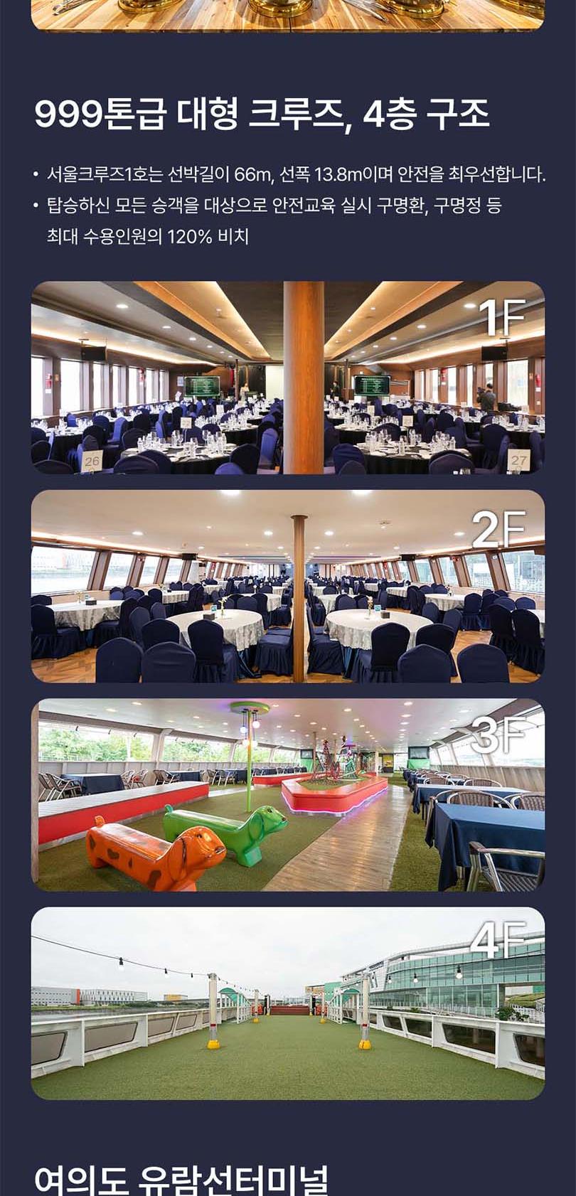 탑승하시면 디너 뷔페가 준비되어 있어요. 계절마다 엄선된 메뉴로 꾸려진 따뜻한 식사와 함께 특별한 저녁을 즐길 수 있어요. 999톤급 규모의 4층 대형 크루즈라서 탁 트인 데크에서 노을을 바라보거나 실내에서 편안하게 식사하며 한강의 풍경을 감상할 수 있어요. 모든 승객을 대상으로 안전 교육을 진행하고, 구명환과 구명정 등 최대 수용 인원의 120% 이상의 안전 장비를 갖추고 있어 믿고 여행할 수 있어요.