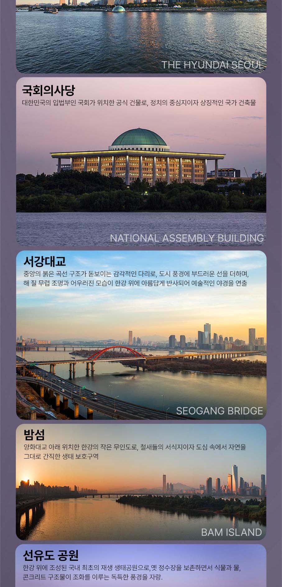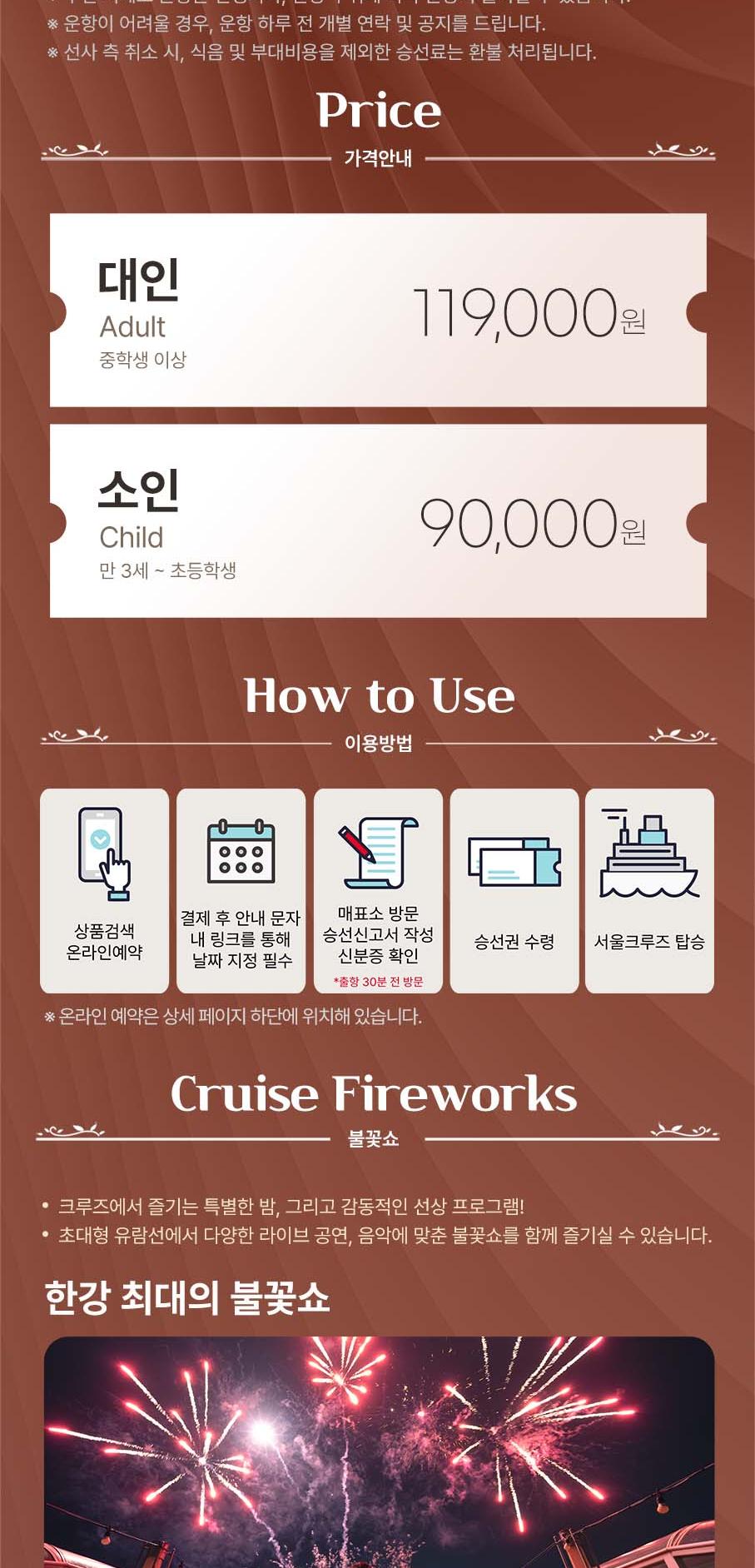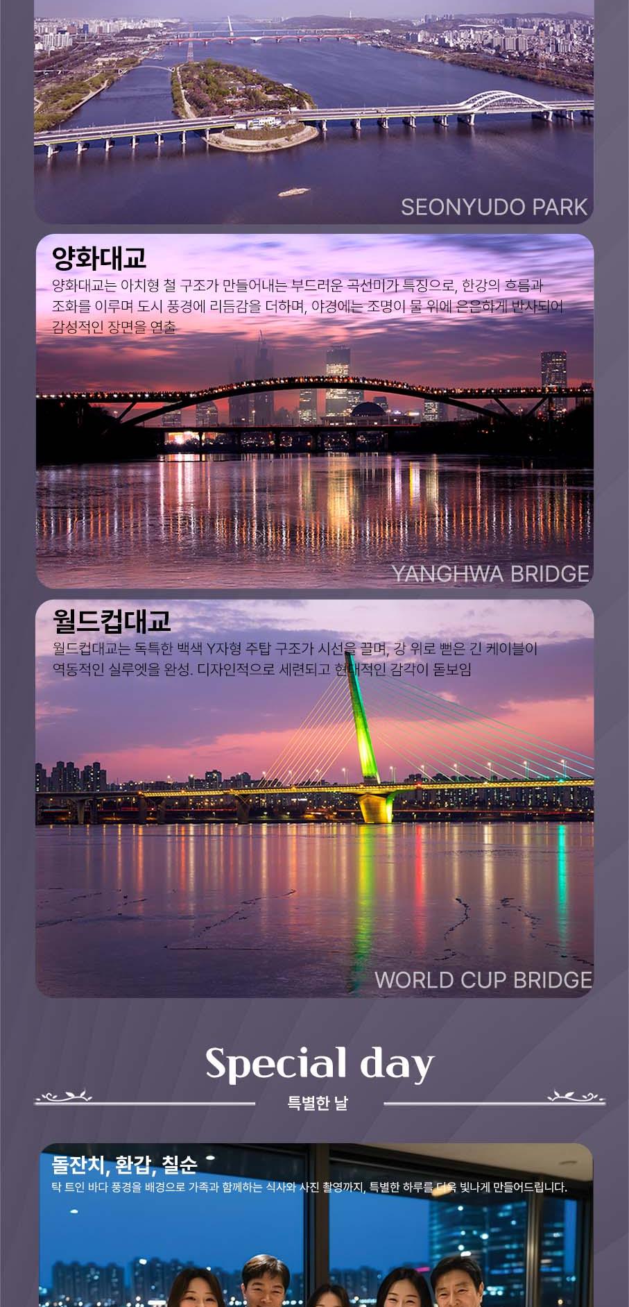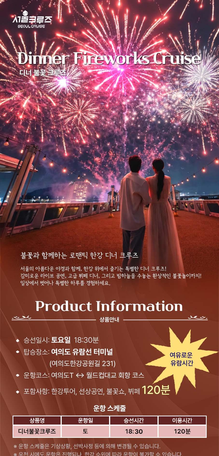 한국어 제공불꽃과 음악, 그리고 미식이 어우러진 서울 크루즈 한강 디너 불꽃 크루즈는 일상에서 벗어나 특별한 밤을 선물하는 로맨틱한 한강 여행이에요. 여의도 유람선 터미널에서 출발해 월드컵대교까지 회항하는 약 120분 코스로, 서울의 화려한 야경을 가장 가까이에서 만날 수 있어요. 🌃✨