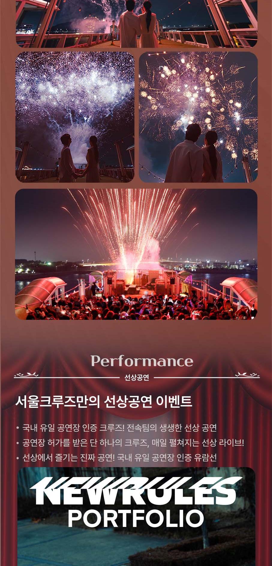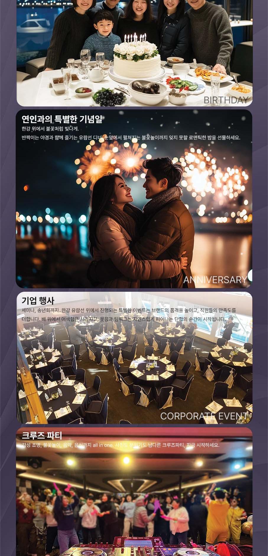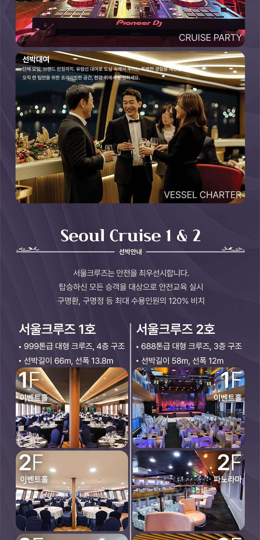 서울 크루즈는 안전을 최우선으로 생각해 탑승객 전원 대상 안전교육을 실시하고, 구명환·구명정 등 안전 장비를 수용 인원의 120% 이상 비치해 안심하고 즐길 수 있어요! 밤하늘을 수놓는 환상적인 불꽃놀이와 함께 감미로운 라이브 공연이 선상에서 펼쳐지며, 음악에 맞춰 연출되는 불꽃 쇼는 이 크루즈에서만 경험할 수 있는 하이라이트예요. 국내 유일 공연장 인증 유람선으로, 전속 공연팀이 매일 생생한 선상 라이브를 선보여 ‘진짜 공연’을 한강 위에서 즐길 수 있답니다. 🎶🎇 디너 타임에는 계절별로 엄선된 고급 뷔페 디너가 준비되어, 맛있는 식사와 함께 소중한 사람과의 시간을 더욱 특별하게 만들어줘요. 초대형 유람선에서 즐기는 다채로운 선상 프로그램과 감동적인 공연은 연인, 가족, 친구 누구와 함께해도 잊지 못할 추억이 될 거예요. 🍽️💖