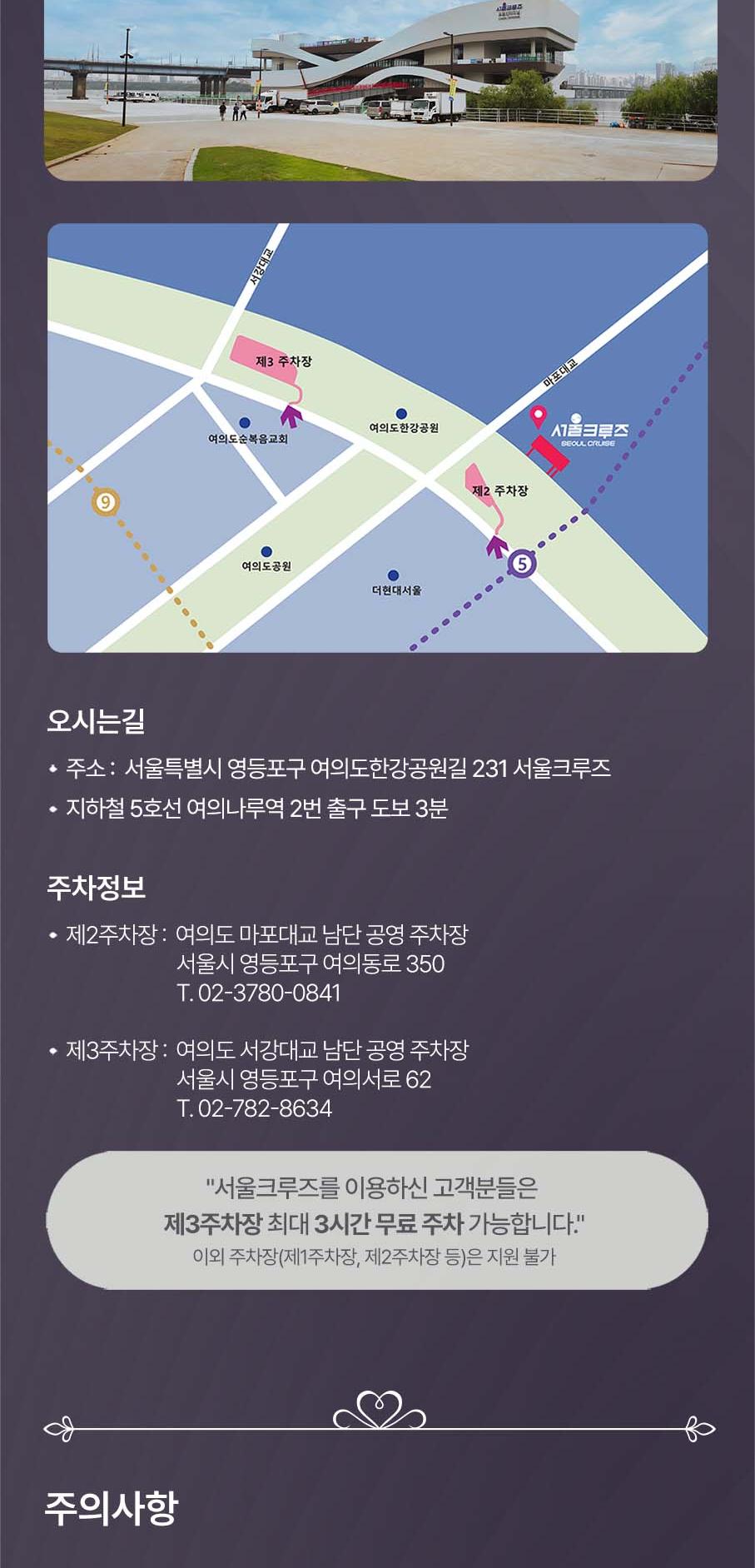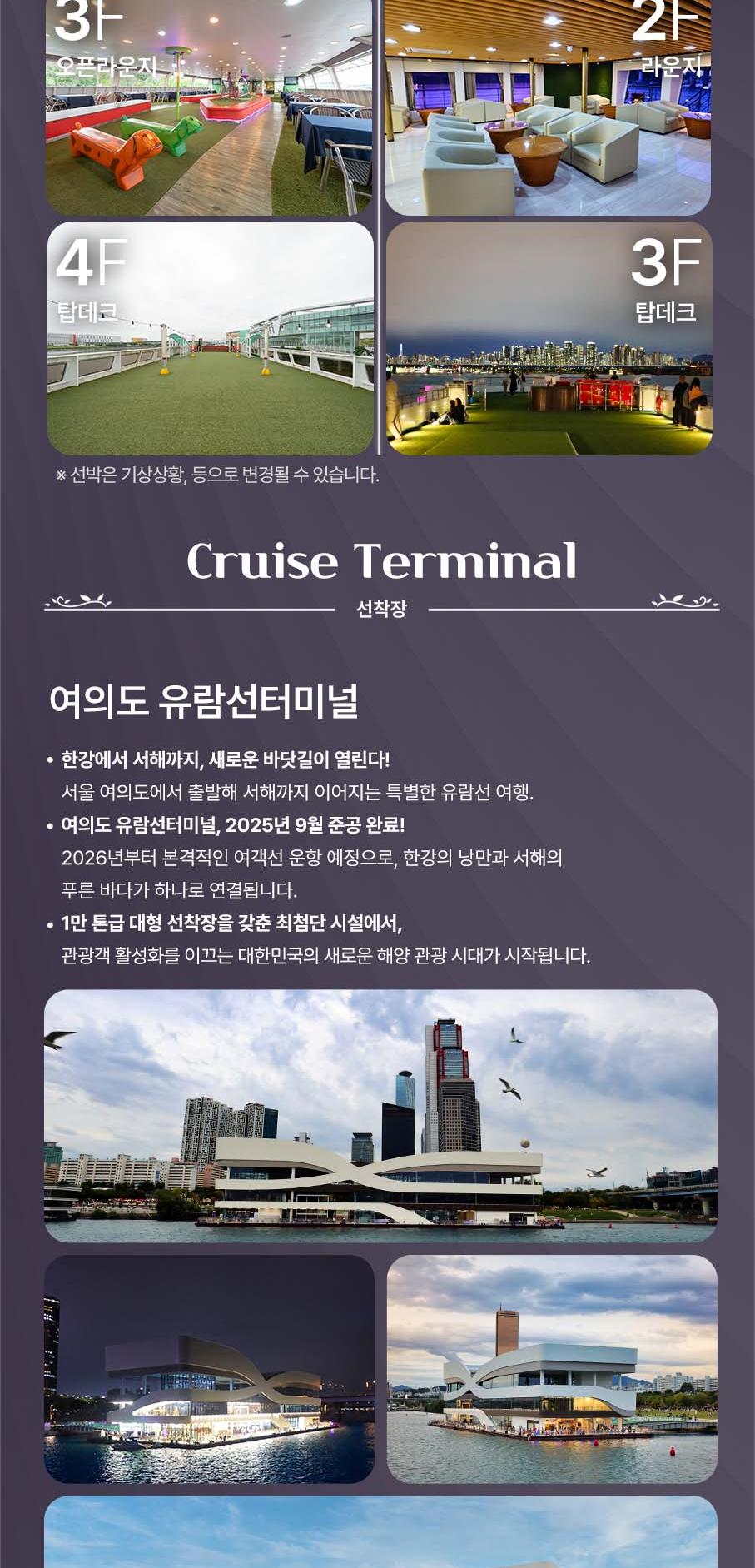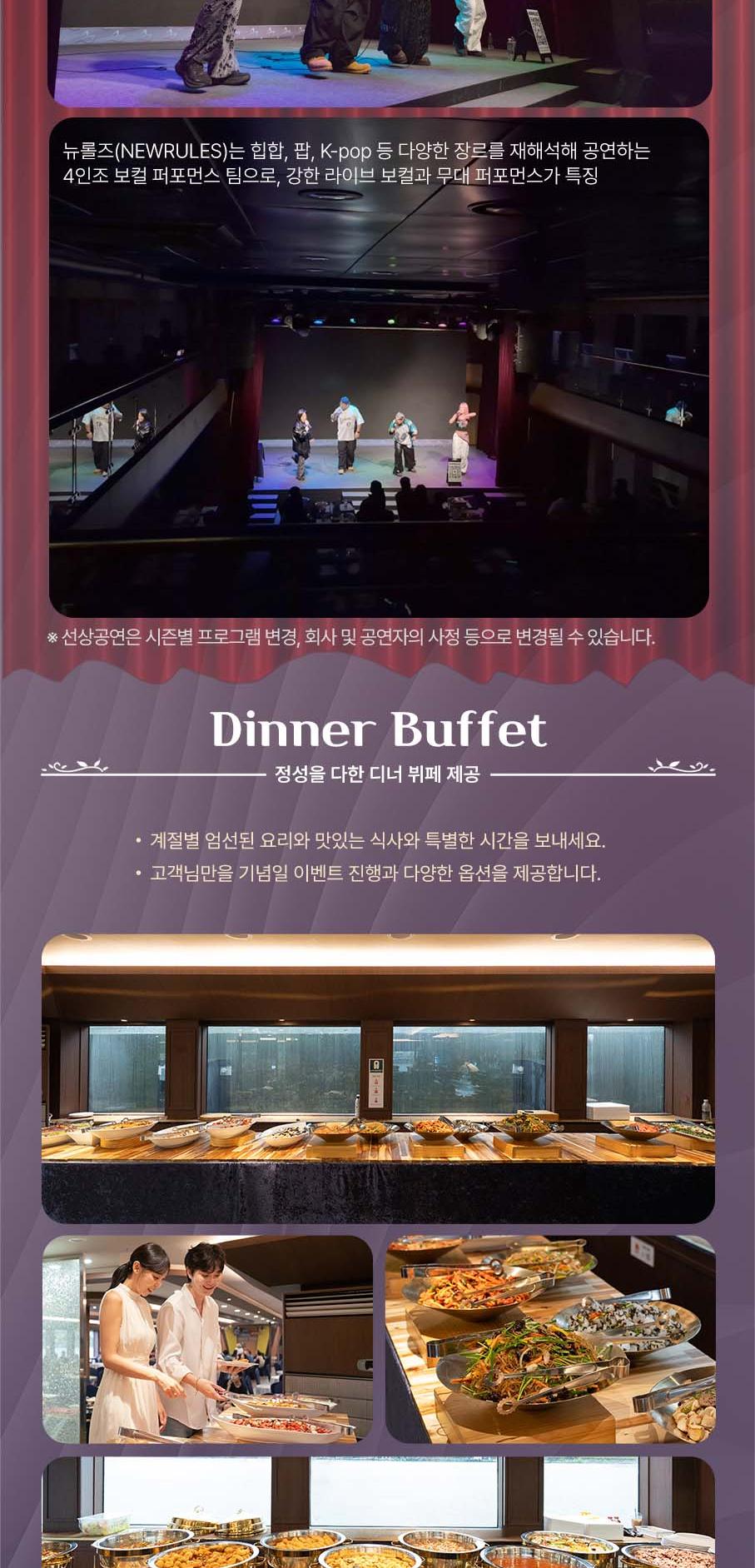 서울 크루즈는 안전을 최우선으로 생각해 탑승객 전원 대상 안전교육을 실시하고, 구명환·구명정 등 안전 장비를 수용 인원의 120% 이상 비치해 안심하고 즐길 수 있어요! 밤하늘을 수놓는 환상적인 불꽃놀이와 함께 감미로운 라이브 공연이 선상에서 펼쳐지며, 음악에 맞춰 연출되는 불꽃 쇼는 이 크루즈에서만 경험할 수 있는 하이라이트예요. 국내 유일 공연장 인증 유람선으로, 전속 공연팀이 매일 생생한 선상 라이브를 선보여 ‘진짜 공연’을 한강 위에서 즐길 수 있답니다. 🎶🎇 디너 타임에는 계절별로 엄선된 고급 뷔페 디너가 준비되어, 맛있는 식사와 함께 소중한 사람과의 시간을 더욱 특별하게 만들어줘요. 초대형 유람선에서 즐기는 다채로운 선상 프로그램과 감동적인 공연은 연인, 가족, 친구 누구와 함께해도 잊지 못할 추억이 될 거예요. 🍽️💖