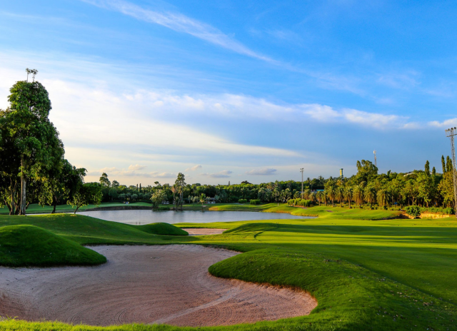 람차방 인터내셔널 컨트리 클럽은 총 27홀, 6,865야드 규모의 코스로 지형의 다양성과 코스 밸런스가 잘 어우러져 있어요. 각 9홀은 산악 지형의 Mountain 코스, 수로와 연못이 어우러진 Lake 코스, 완만한 언듈레이션이 이어지는 Valley 코스로 구성되어 있어 라운드마다 다른 공략법과 재미를 느낄 수 있답니다. 버뮤다 잔디로 조성된 페어웨이와 그린은 탄력 있는 구름과 안정적인 퍼팅 감각을 제공하며, 특히 Lake 코스의 워터 해저드와 벙커 주변의 섬세한 설계가 골퍼의 집중력과 샷 컨트롤을 시험해요. 한 코스 안에서 세 가지 분위기를 모두 경험할 수 있는 점이 람차방만의 매력이에요.