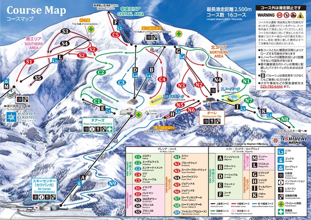 세 구역(북·중앙·남 에리어)으로 나뉜 슬로프에는 총 16개의 다양한 코스가 마련되어 있어요. 초보자에게 인기인 완만한 크루즈 코스부터 상급자를 위한 급경사·모글 코스, 스노우파크까지 구성되어 있어 누구나 실력에 맞는 활주를 즐길 수 있습니다. 특히 ‘팔콘(Falcon)’ 코스는 약 2.5km 길이의 롱 크루즈로, 설산을 내려다보며 여유롭게 활주할 수 있는 GALA 유자와의 대표 코스예요.