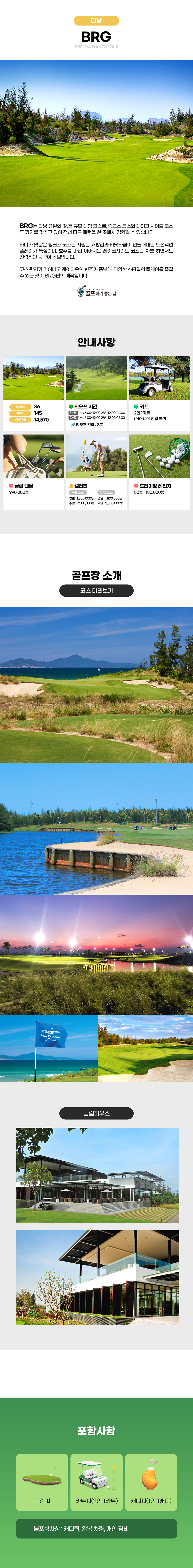 다낭에서 즐길 수 있는 36홀 골프장, BRG 골프장이에요. 한 곳에서 두 가지 전혀 다른 코스를 경험할 수 있어 색다른 재미가 있어요. 바닷가와 가까운 링크스 코스에서는 탁 트인 전망과 시원한 바람 속에서 도전적인 샷을 즐길 수 있고, 호수를 따라 이어지는 레이크 사이드 코스는 차분하게 전략을 세우며 플레이할 수 있어요. 코스 상태가 항상 잘 관리되어 있고, 레이아웃도 변화가 많아 다양한 스타일의 라운드를 즐기기 좋아요. 다낭 골프 여행에서 여러 느낌을 한 번에 경험하고 싶다면 꼭 추천드리는 곳이에요.