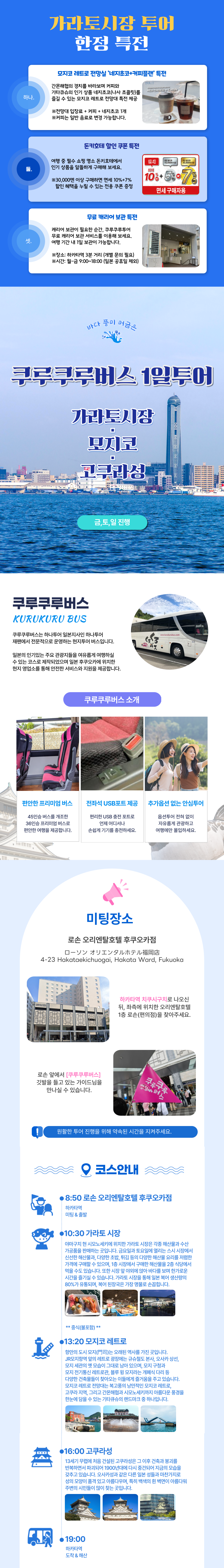 신선한 해산물을 판매하는 가라토 시장과 레트로 분위기의 모지코 레트로, 품격있고 아름다운 고쿠라성까지 하루에 모두 방문해 보세요!