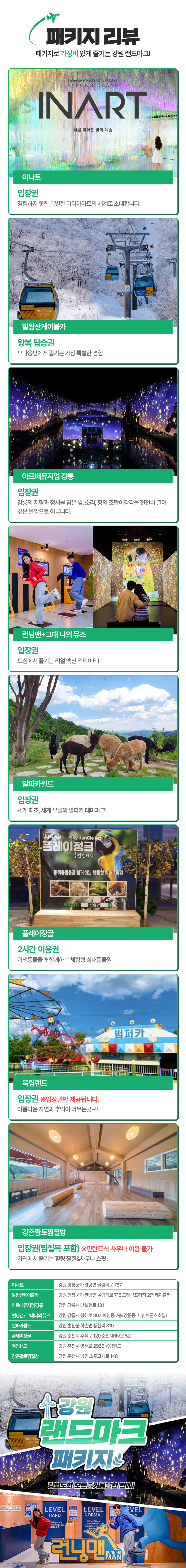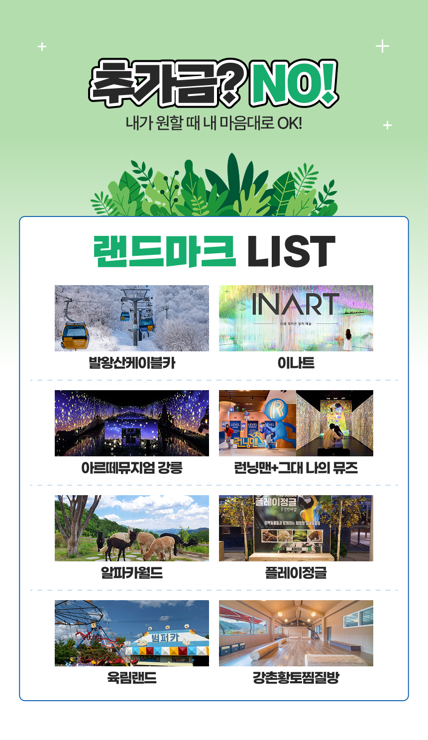 강원 랜드마크 패키지는 강원도의 인기 명소 중에서 내가 원하는 시설을 자유롭게 선택하는 구조로 2개, 3개, 4개, MD 추천 패키지까지 다양하게 준비되어 있어요. 아르떼뮤지엄 강릉, 런닝맨+그댄 나의 뮤즈, 알파카월드, 플레이정글, 육림랜드, 강촌 황토찜질방 중에서 취향대로 조합해 나만의 여행 코스를 만들 수 있으며, 각각 개별 구매하는 것보다 훨씬 더 합리적인 가격으로 이용할 수 있어요.