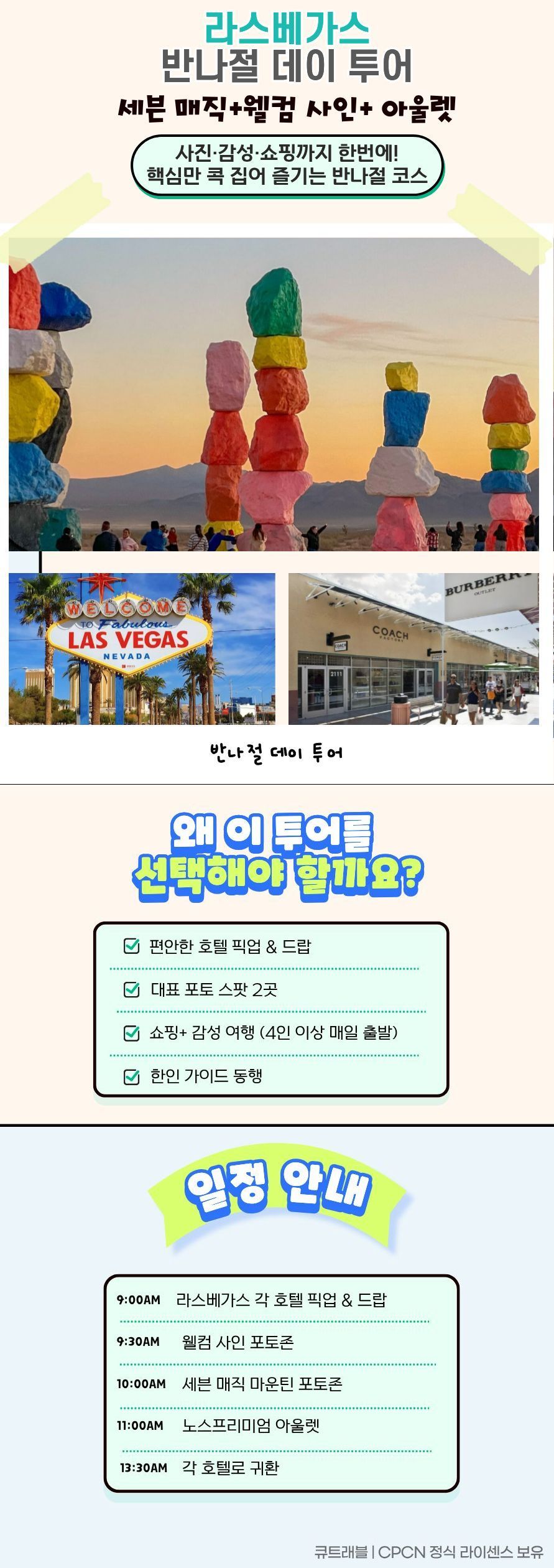 라스베가스에서 가장 사랑받는 명소만 골라 알차게 구성된 반나절 데이투어예요. 웰컴 투 라스베가스 사인에서 시작해 다채로운 색감의 세븐 매직 마운틴을 감상하며 감성 가득한 사진을 남길 수 있어요. 이후 노스 프리미엄 아울렛에서 자유롭게 쇼핑을 즐기며 여유로운 시간을 보내요. 짧지만 탄탄한 구성으로 여행 일정의 공백 시간을 효율적으로 활용할 수 있어요. 편안한 차량 이동과 부담 없는 동선으로 누구나 쉽게 참여할 수 있어요.