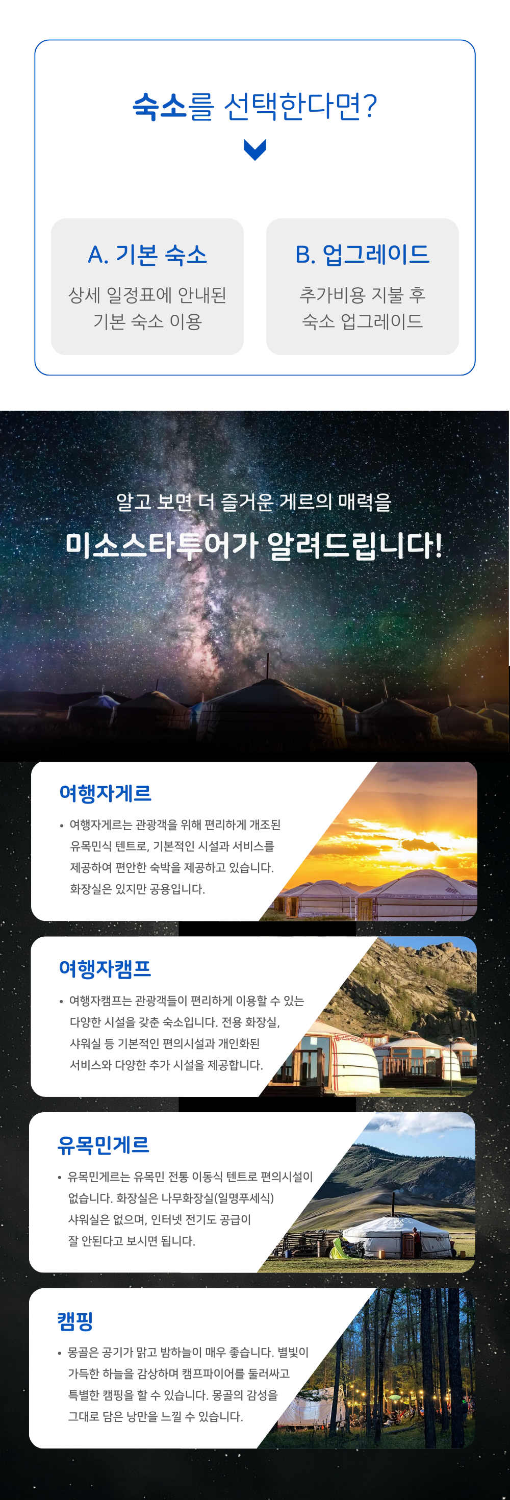각 지역의 대표 스팟을 방문하며 트래킹과 체험 활동을 함께 즐길 수 있어요. 전일정 가이드·차량·식사가 제공되어 이동과 식사 걱정 없이 편하게 여행할 수 있어요. 여행자 게르 또는 캠프에서 머물며 현지의 생활 방식을 가까이에서 느낄 수 있으며 유목민 마을 관광, 트래킹, 별빛 체험 등의 다양한 자연과 함께하는 프로그램으로 구성되어 있어서 자연 속 힐링을 원하는 분들께 추천드려요!