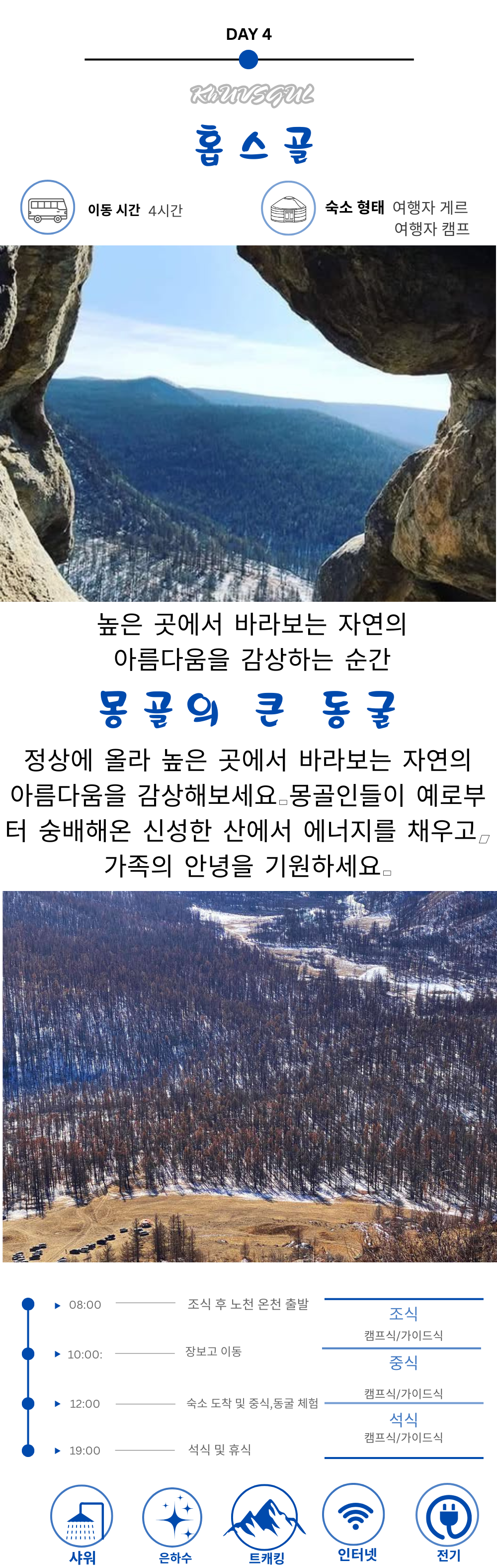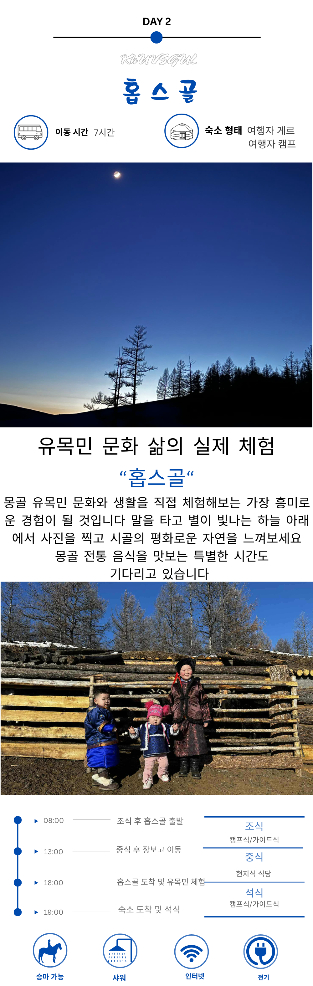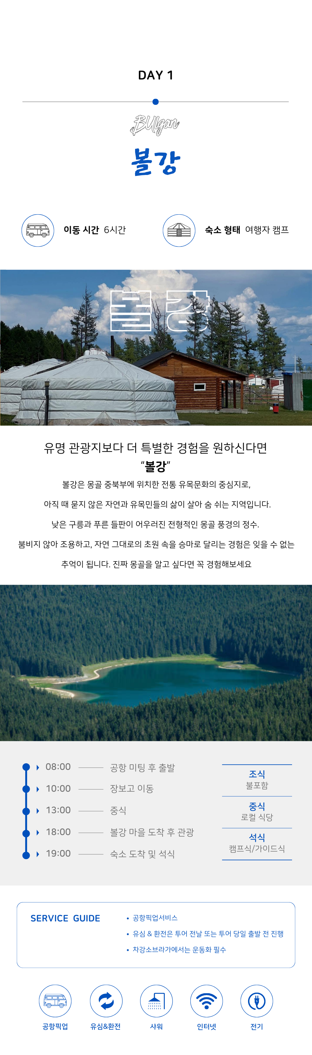 볼강과 홉스골의 핵심 명소를 5박 6일 동안 둘러보며 호수와 초원의 자연을 제대로 경험할 수 있는 일정이에요.