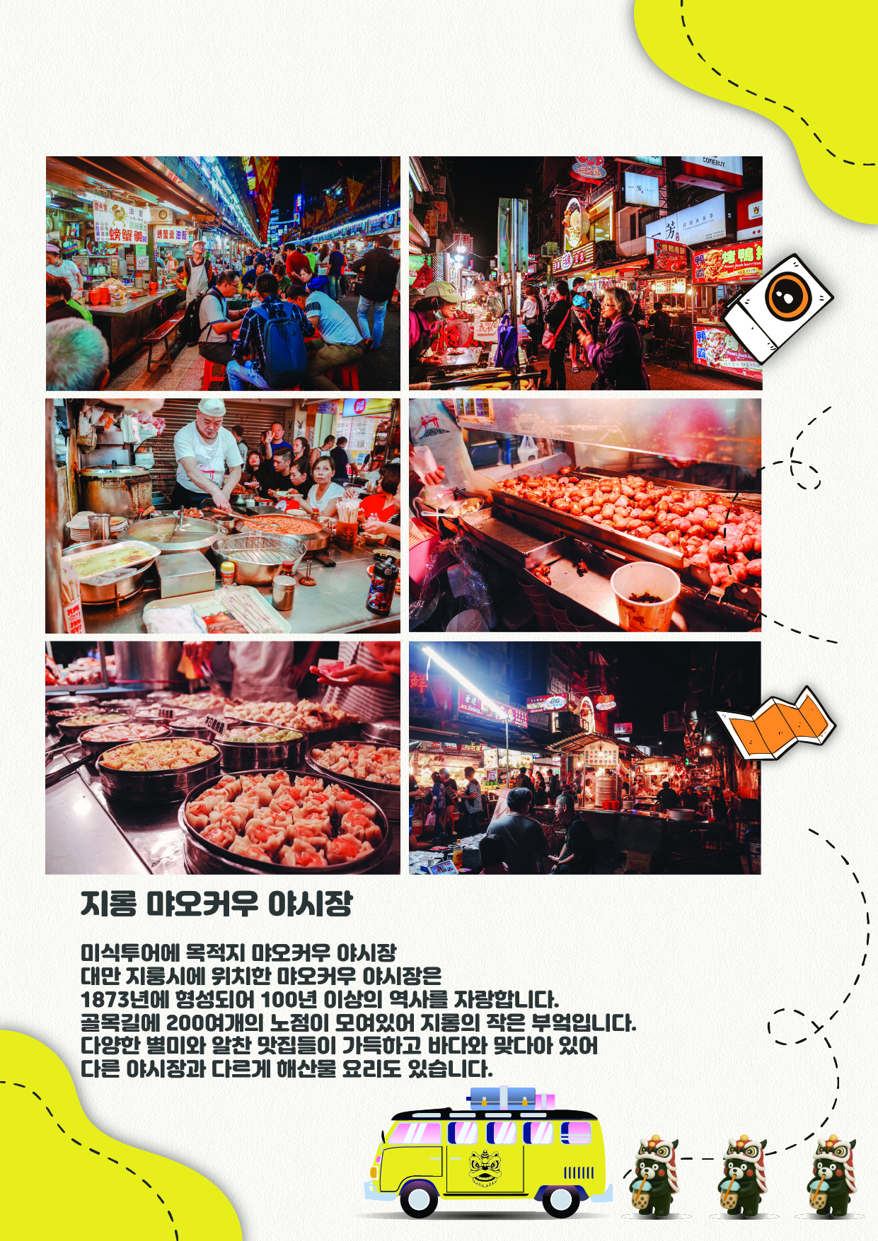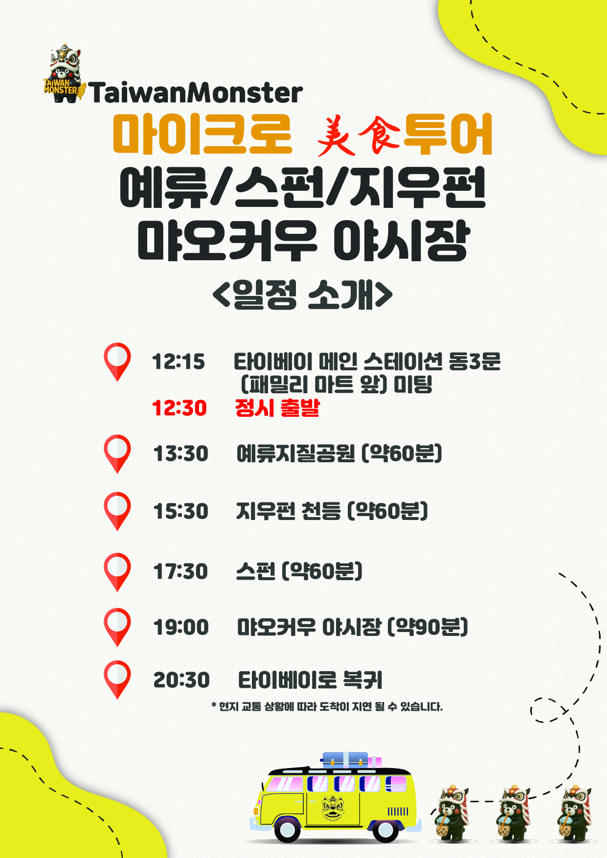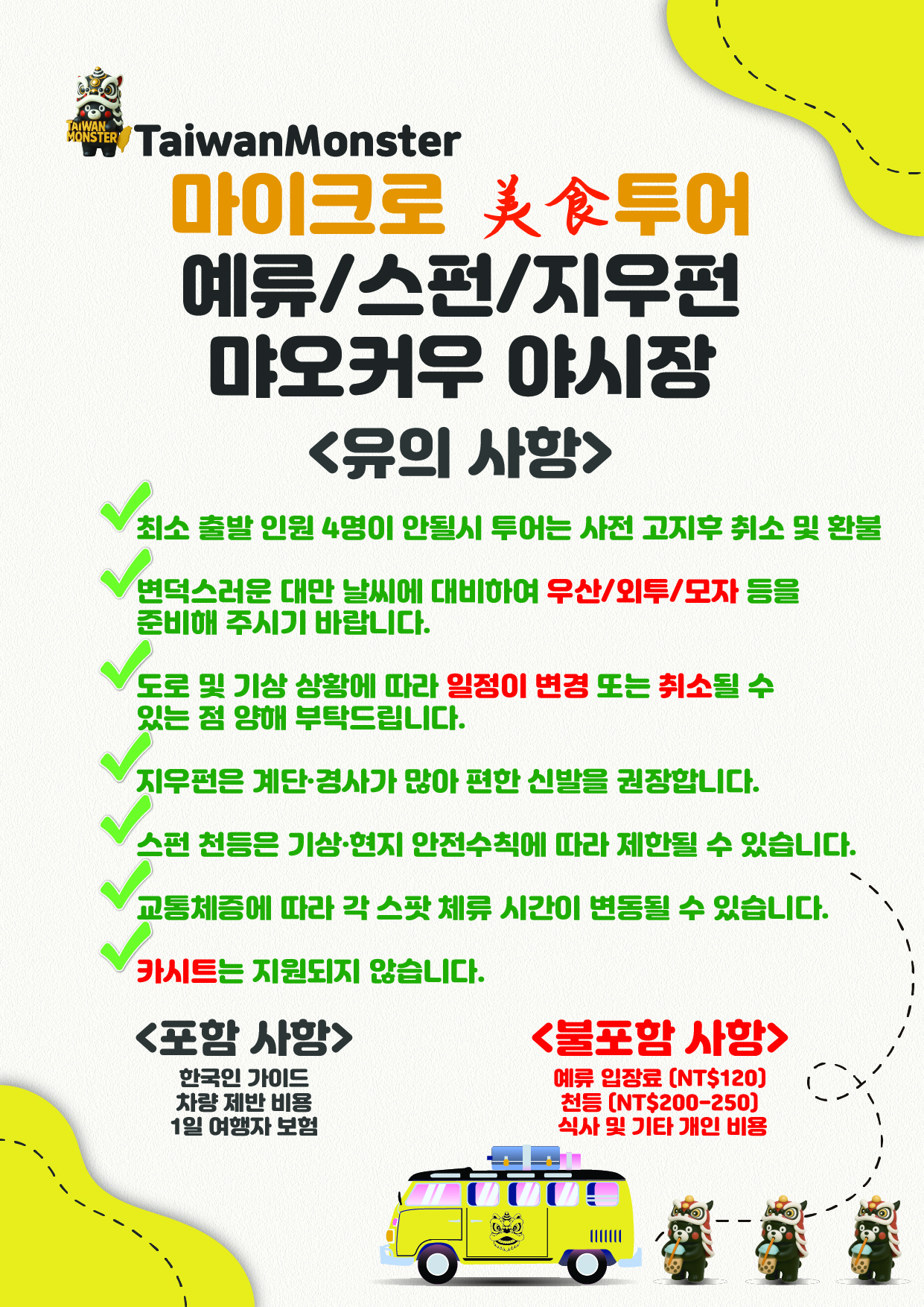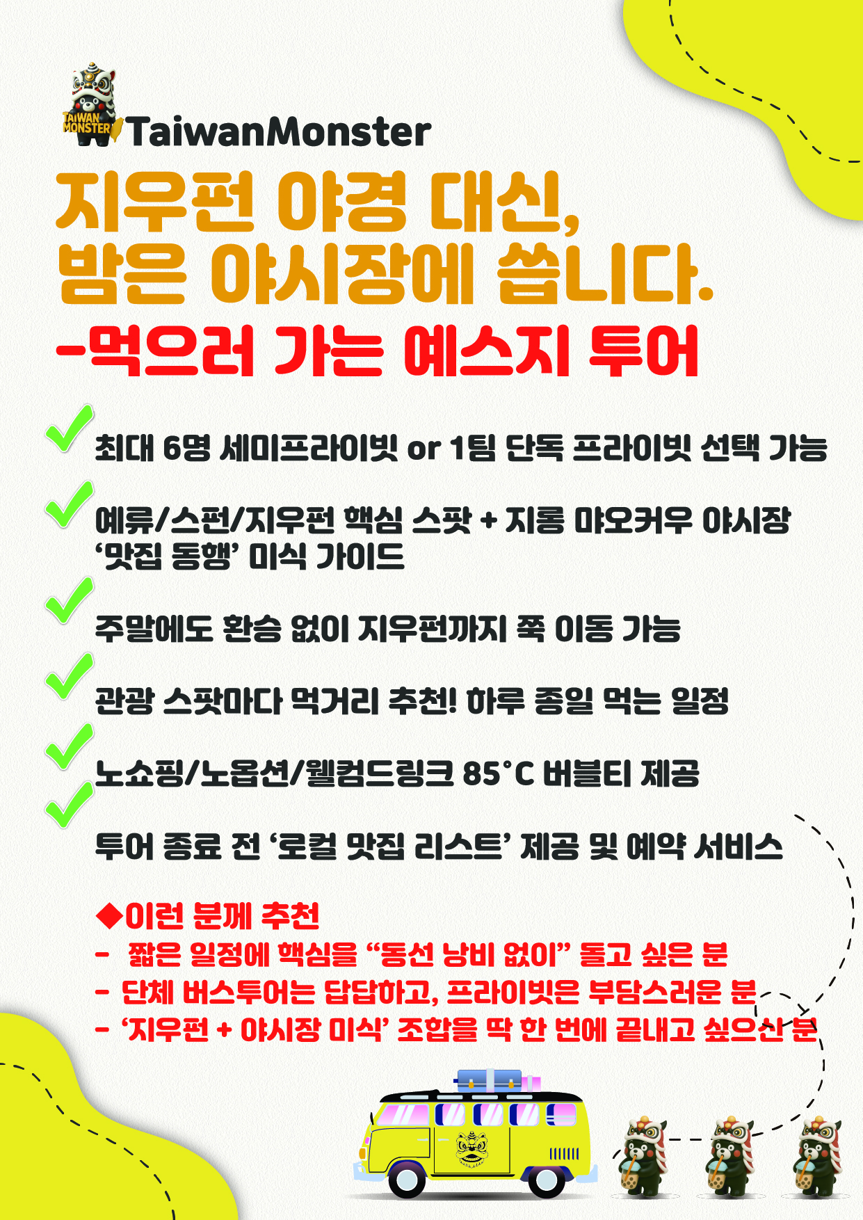 정오에 출발하는 일정이라 오전 시간을 여유롭게 활용할 수 있고, 9인승 차량으로 이동해 주말에도 대중교통 환승 없이 지우펀까지 편하게 이동해요. 소규모 세미 프라이빗 투어로 최소 4인부터 최대 8인까지만 진행되어 이동 동선이 효율적이고 각 관광지에서 충분한 체류 시간을 확보해요. 투어의 마지막에는 타이완 현지인들이 즐겨 찾는 지룽 먀오커우 야시장에서 다양한 길거리 음식과 특색 있는 분위기를 직접 체험해 보세요.
