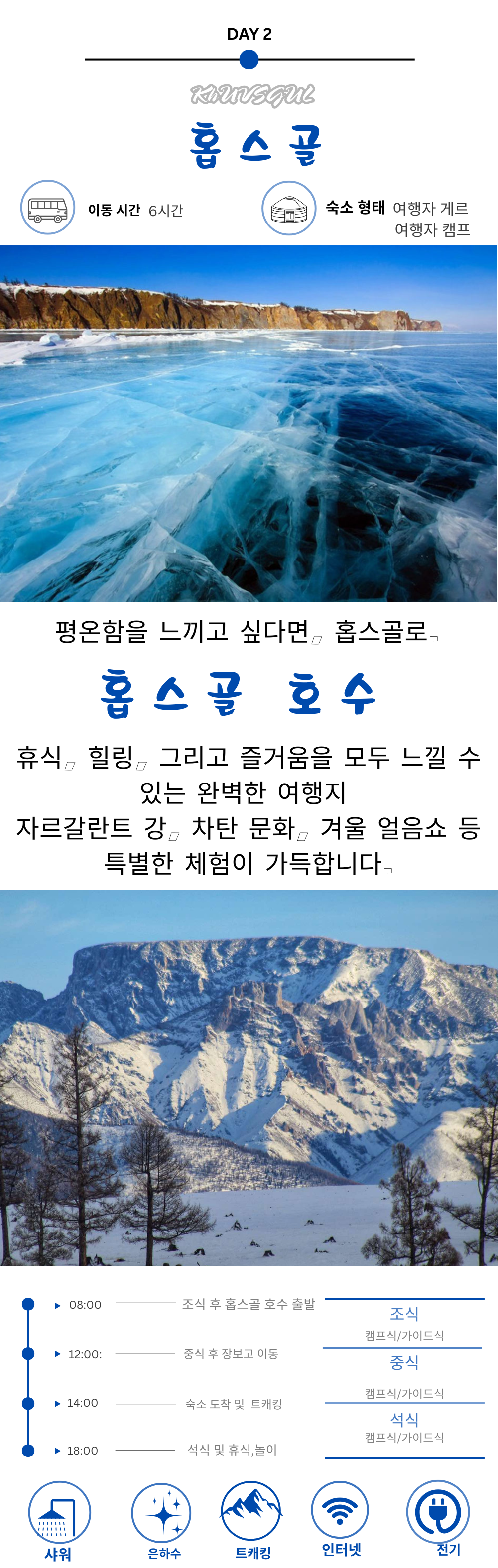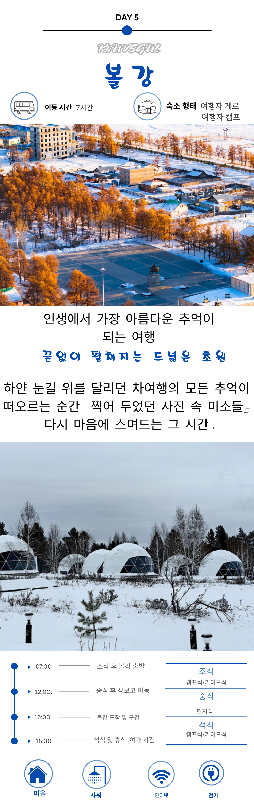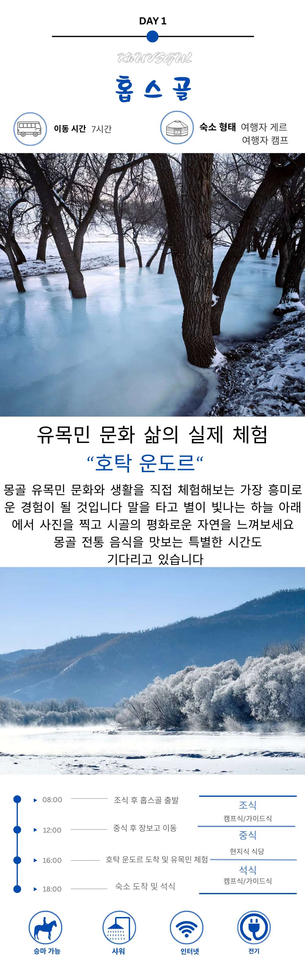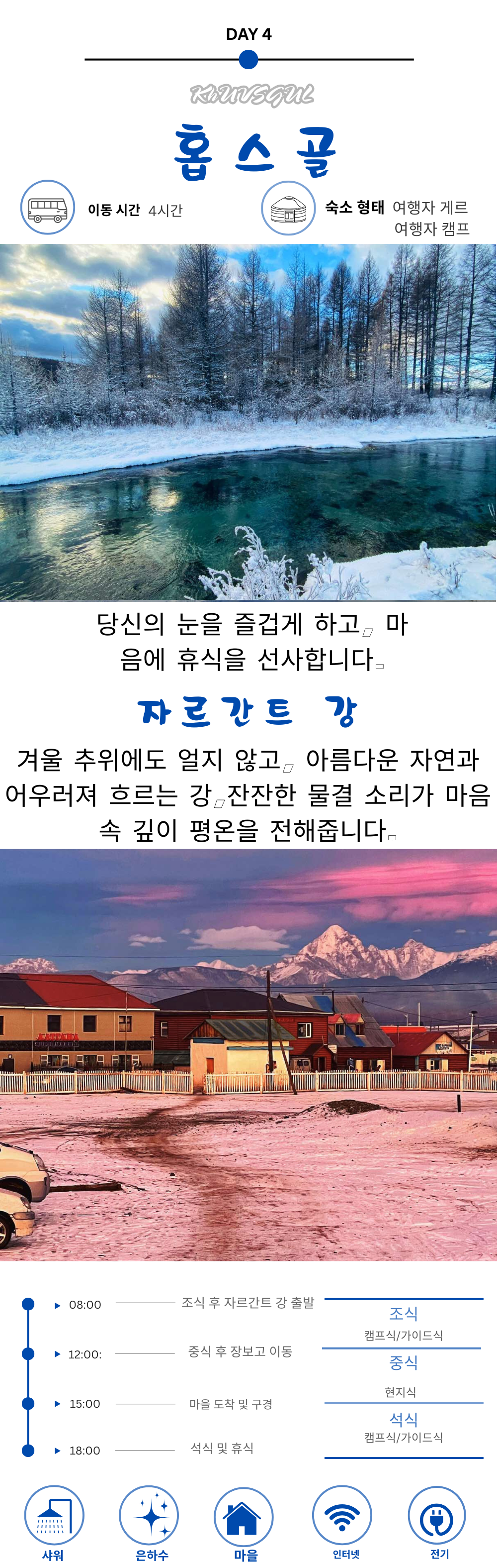자르간트 강, 볼강과 홉스골의 핵심 명소를 5박 6일 동안 둘러보며 호수와 초원의 자연을 제대로 경험할 수 있는 일정이에요.