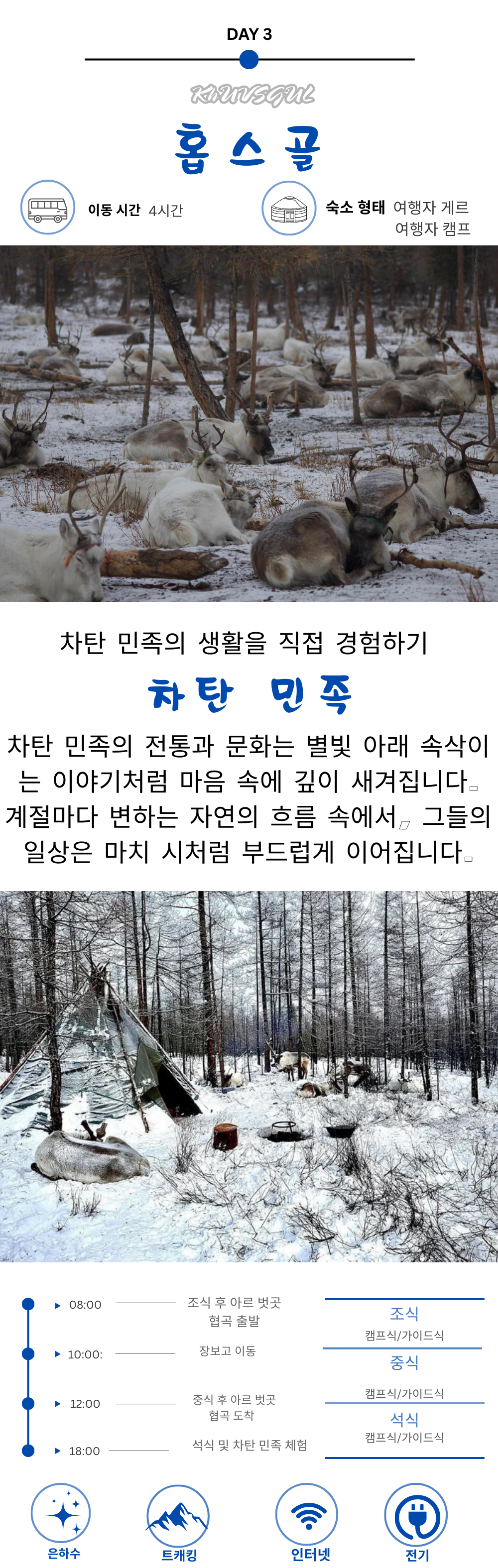 각 지역의 대표 스팟을 방문하며 트래킹과 체험 활동을 함께 즐길 수 있어요. 전일정 가이드·차량·식사가 제공되어 이동과 식사 걱정 없이 편하게 여행할 수 있어요. 여행자 게르 또는 캠프에서 머물며 현지의 생활 방식을 가까이에서 느낄 수 있으며 유목민 마을 관광, 트래킹, 별빛 체험 등의 다양한 자연과 함께하는 프로그램으로 구성되어 있어서 자연 속 힐링을 원하는 분들께 추천드려요!