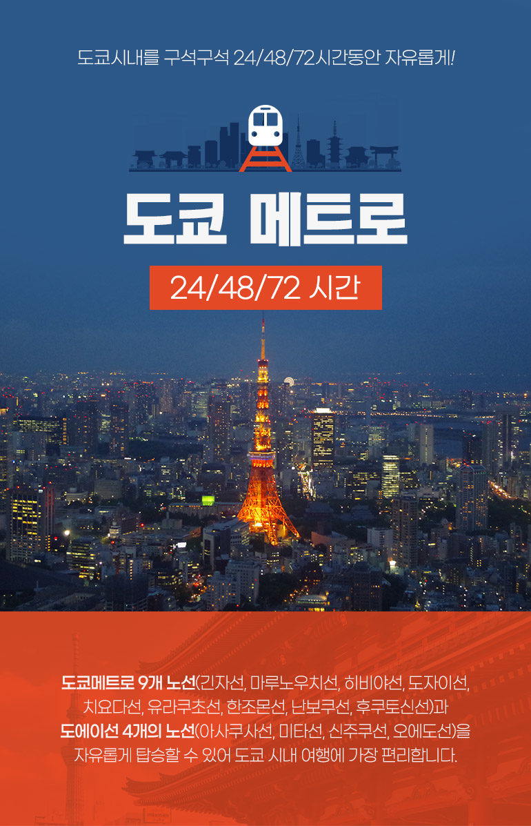이 패스권은 외국인 여행자를 위한 할인 승차권 (Tokyo Subway Ticket)으로 도쿄 메트로의 9개 노선과 도영 지하철 4개 노선을 자유롭게 승하차 할 수 있는 패스권입니다. 대부분의 도쿄 시내를 가장 편하게 지하철을 정해진 시간동안 횟수 제한 없이 자유롭게 이용할 수 있어 도쿄 여행 필수 아이템으로 손꼽히고 있어요.