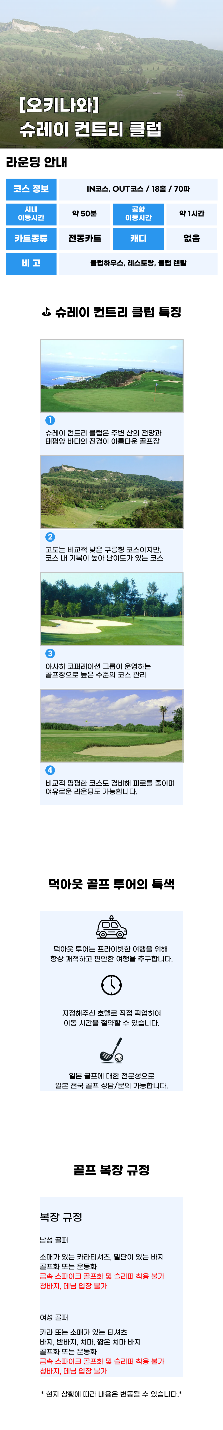 예약 확정 후 기재해주신 호텔 로비 혹은 나하 공항에서 티업 시간에 맞춰 픽업 합니다.