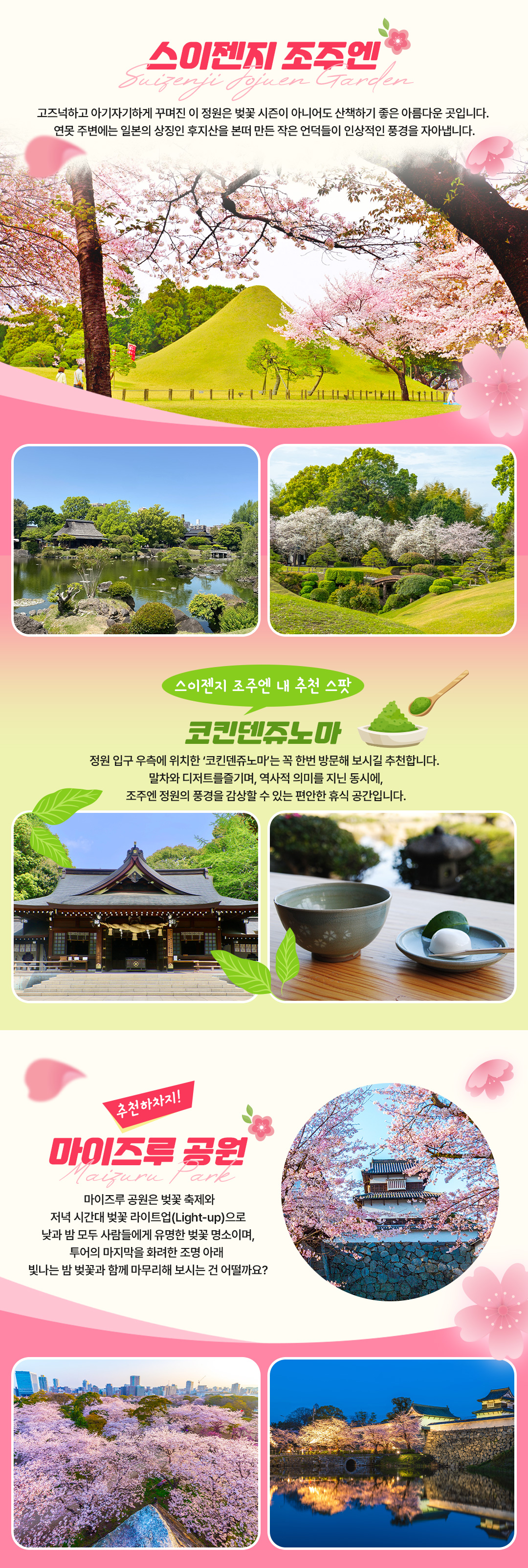 여행의 마지막은 일본 정원의 아름다움이 고요하게 빛나는 스이젠지 조주엔이에요. 잔잔한 연못과 아기자기한 언덕이 어우러져 산책만 해도 마음이 차분해지는 곳이라, 벚꽃 시즌이 아니어도 사랑받는 명소예요. 특히 정원 입구 쪽 코킨덴쥬노마에서는 말차와 디저트로 잠깐 쉬어가며, 다실 안에서 한 폭의 그림처럼 펼쳐지는 정원 풍경을 감상하는 시간을 추천해요. 하루 종일 벚꽃을 담아낸 마음이 여기서 한 번 더 정리되는 느낌이 들어요.