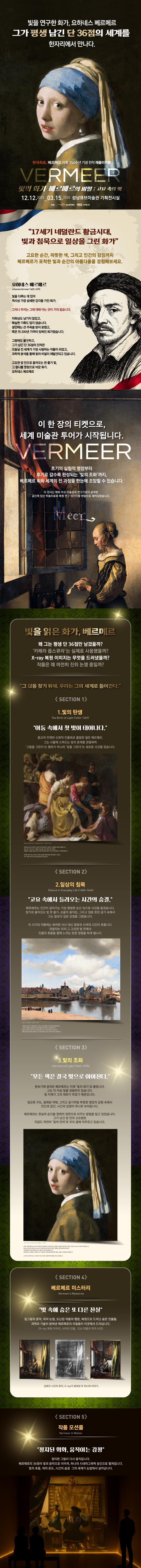 초기의 실험적인 명암부터 후기로 갈수록 완성되는 빛의 조화까지, 베르메르 회화 세계의 전 과정을 한눈에 조망할 수 있는 특별한 전시예요. ‘빛을 읽은 화가’ 베르메르, 왜 그는 평생 단 36점만 남겼을까요? 카메라 옵스큐라는 실제로 사용되었을까요? X-ray 복원 이미지는 무엇을 드러냈고, 그의 작품은 왜 지금도 진위 논쟁의 중심에 있을까요? 우리는 그 답을 찾기 위해 그의 세계로 들어갑니다.