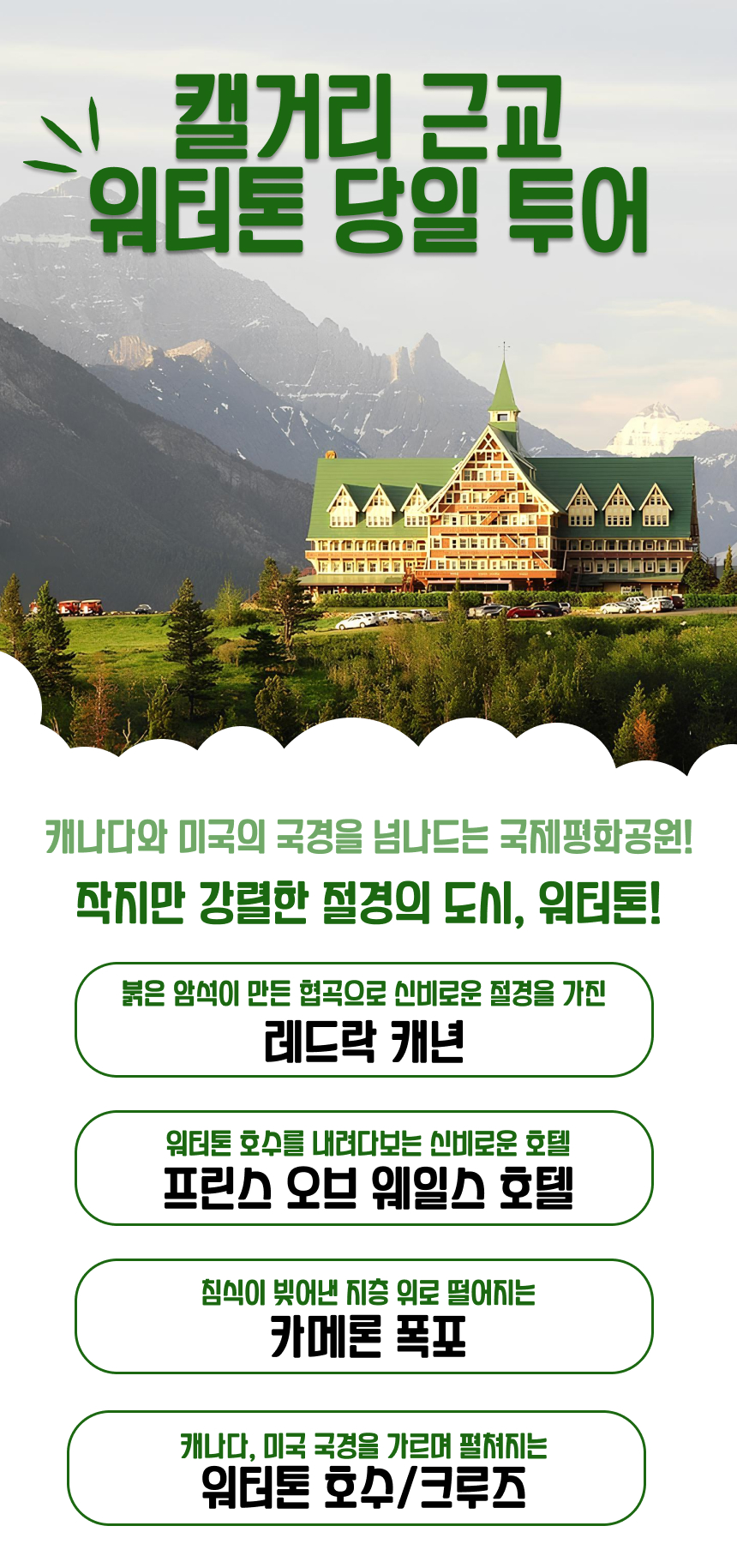 한국어 제공캘거리에서 출발해 워터톤 국립공원으로 이동하는 이 당일 투어는 캐나다와 미국 국경을 넘나드는 워터톤의 핵심 명소를 하루에 모두 둘러보는 일정이에요.
