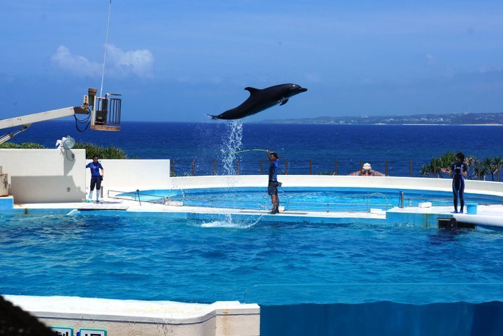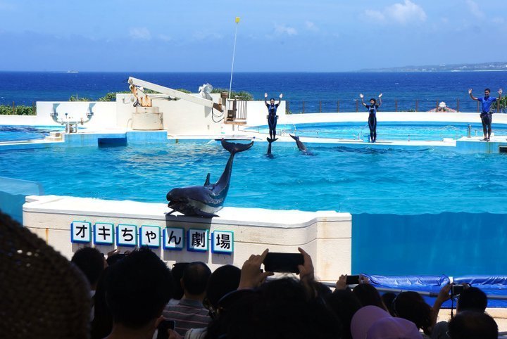 츄라우미 수족관 오키짱 극장에서는 돌고래 공연이 펼쳐져요! 쇼를 통해 돌고래의 생태와 돌고래의 능력에 대해 알아볼 수 있어요. 오키짱 극장은 츄라우미 수족관 입장권만 있다면 누구나 무료로 관람할 수 있어요.