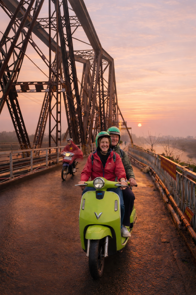 하노이의 상징적인 롱비엔 다리로 스쿠터를 타고 이동해요.
