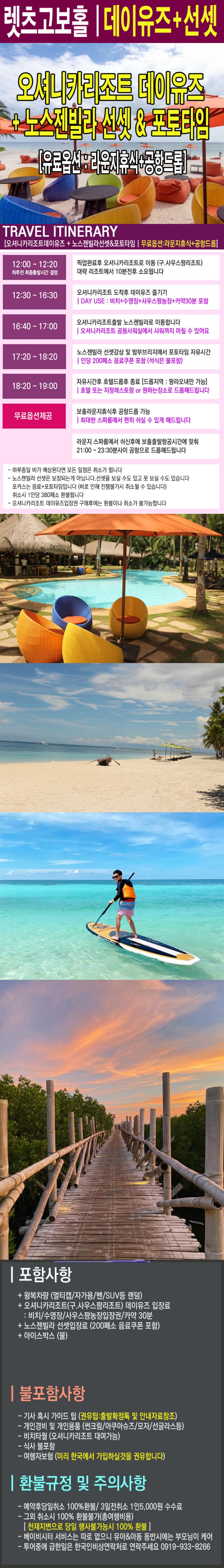보홀에서 하루를 보내면서 휴식과 활동을 동시에 즐기고 싶다면 이 상품이 딱이에요! 호텔 픽업부터 드랍 서비스까지 포함되어 있어서 이동 걱정 없이 바로 여행을 시작할 수 있어요. 오셔니카 리조트에서는 탁 트인 바다와 수영장에서 여유롭게 휴식을 즐기다가, 카약 타기와 해변 산책 등 활동적인 시간으로 하루를 채울 수 있어요. 바다 위에서 느끼는 시원한 바람과 파도는 일상에서는 느낄 수 없는 상쾌한 즐거움을 줘요. 해질 무렵에는 노스젠 빌라로 이동해 밤부 브릿지를 걷고 선셋을 감상하며 하루를 마무리해요. 붉게 물드는 하늘과 잔잔한 바다를 바라보며 걷는 동안, 활동과 휴식이 완벽하게 어우러진 특별한 순간을 경험할 수 있어요.