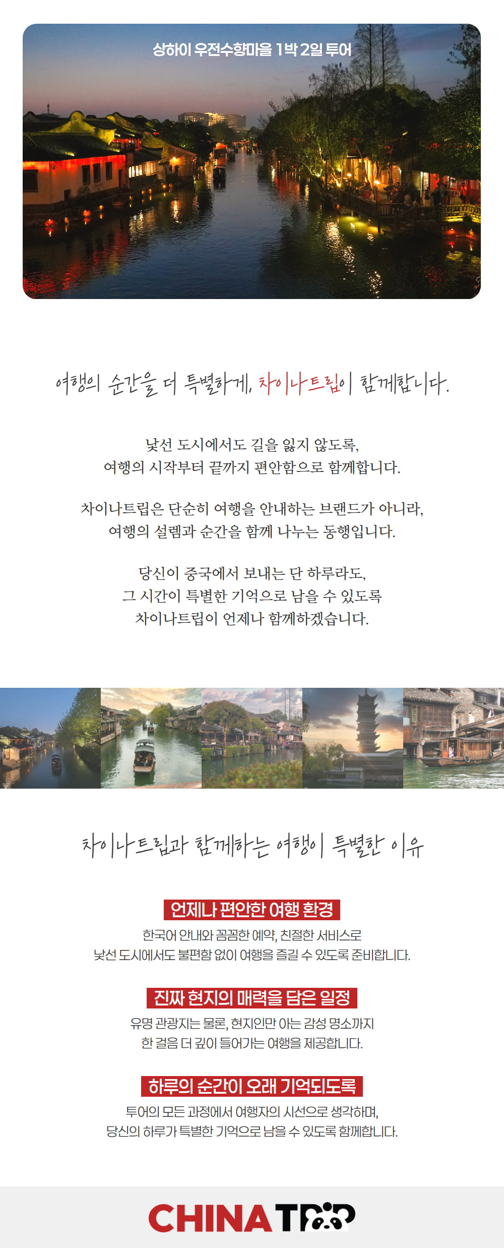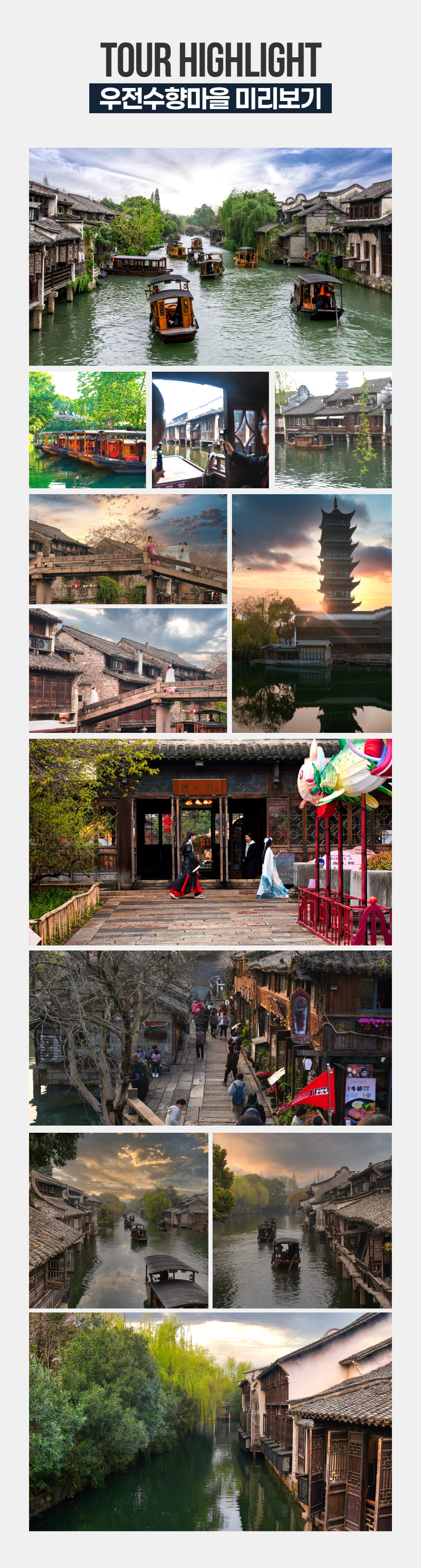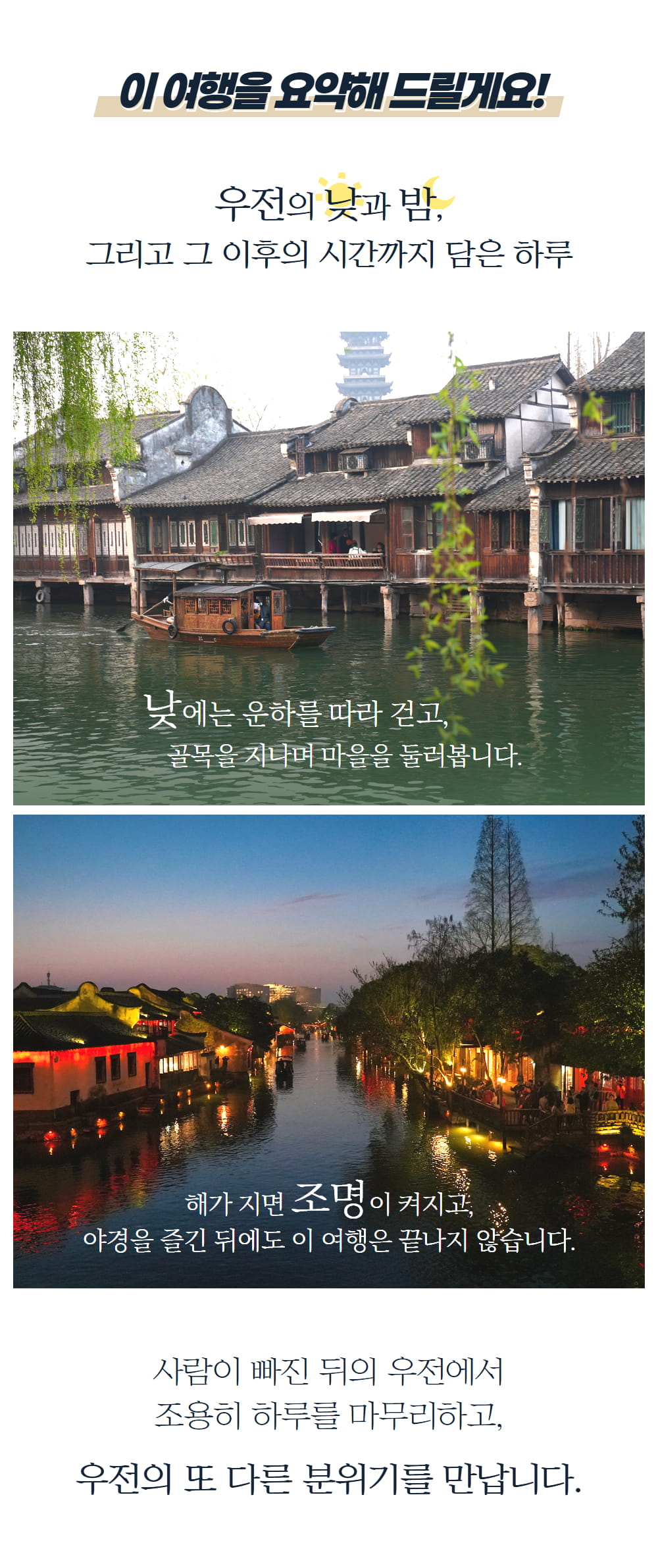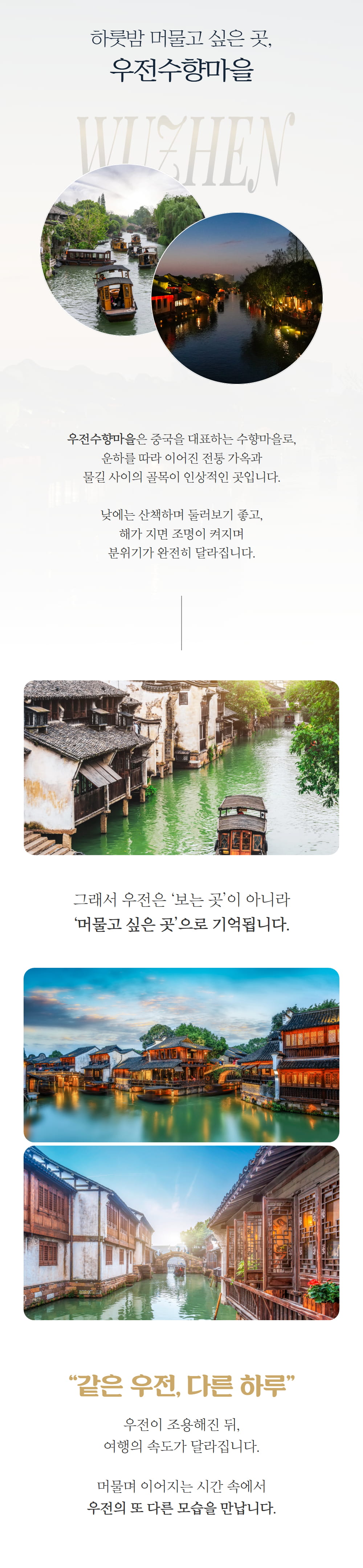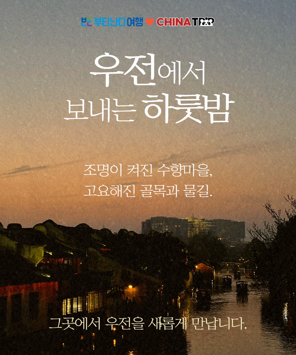 상하이 여행에서 놓칠 수 없는 우전 수향마을을 낮과 밤 모두 깊이 있게 경험하는 1박 2일 일정으로, 낮에는 운하를 따라 걷고 골목 사이를 지나며 마을의 정취를 느끼고 해가 지면 조명이 켜진 수향마을의 야경을 감상할 수 있어요.