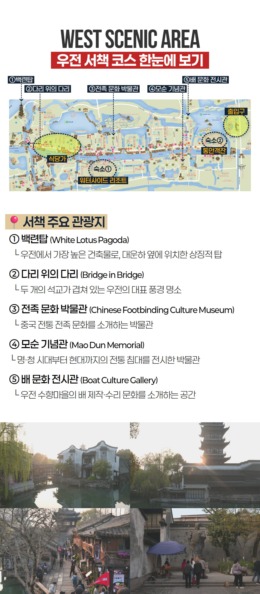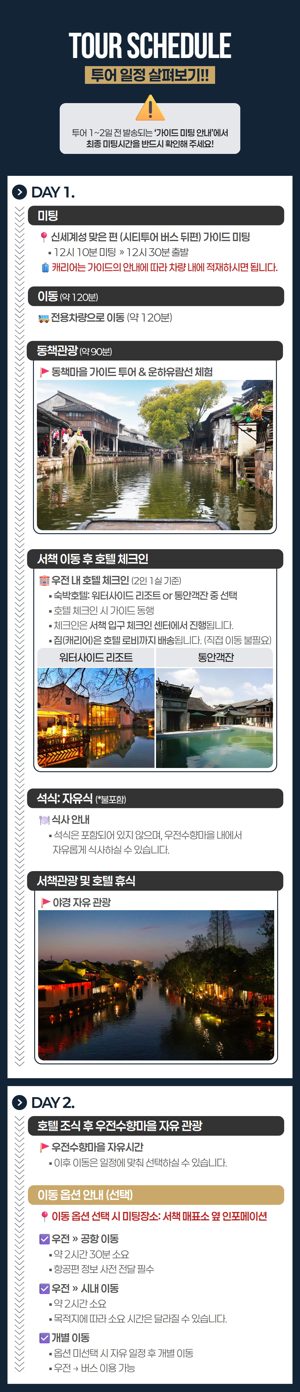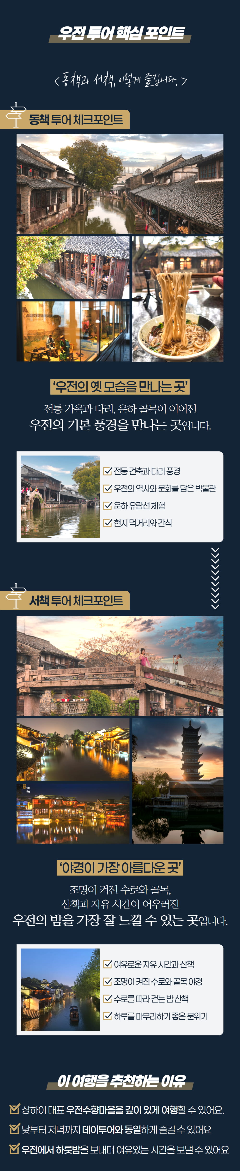 동책에서는 우전의 전통적인 옛 모습을, 서책에서는 조용해진 골목과 물길 위에 비치는 밤 풍경을 만나며 데이투어와 동일한 관광을 충분히 즐겨보세요. 우전에서 하룻밤을 보내며 여유로운 시간을 보낼 수 있고, 한국어 가이드 동행과 5성급 리조트 숙박이 포함되어 이동과 일정 걱정 없이 편안하게 상하이 대표 수향마을을 여행할 수 있답니다.