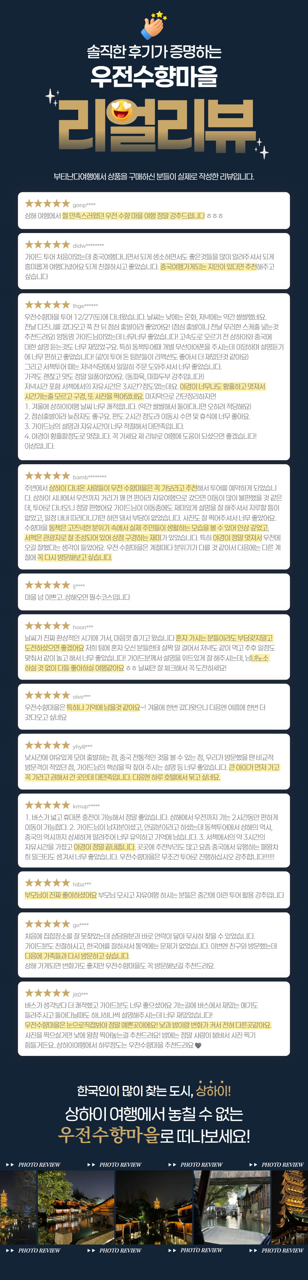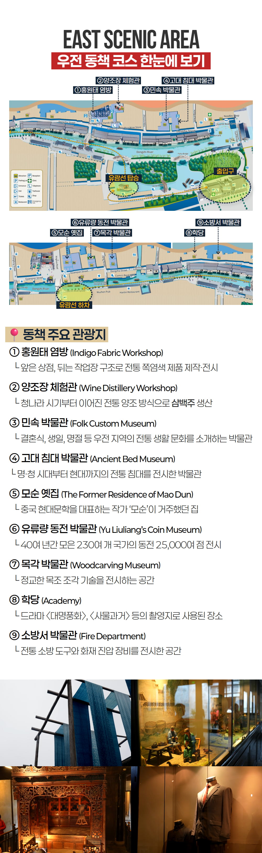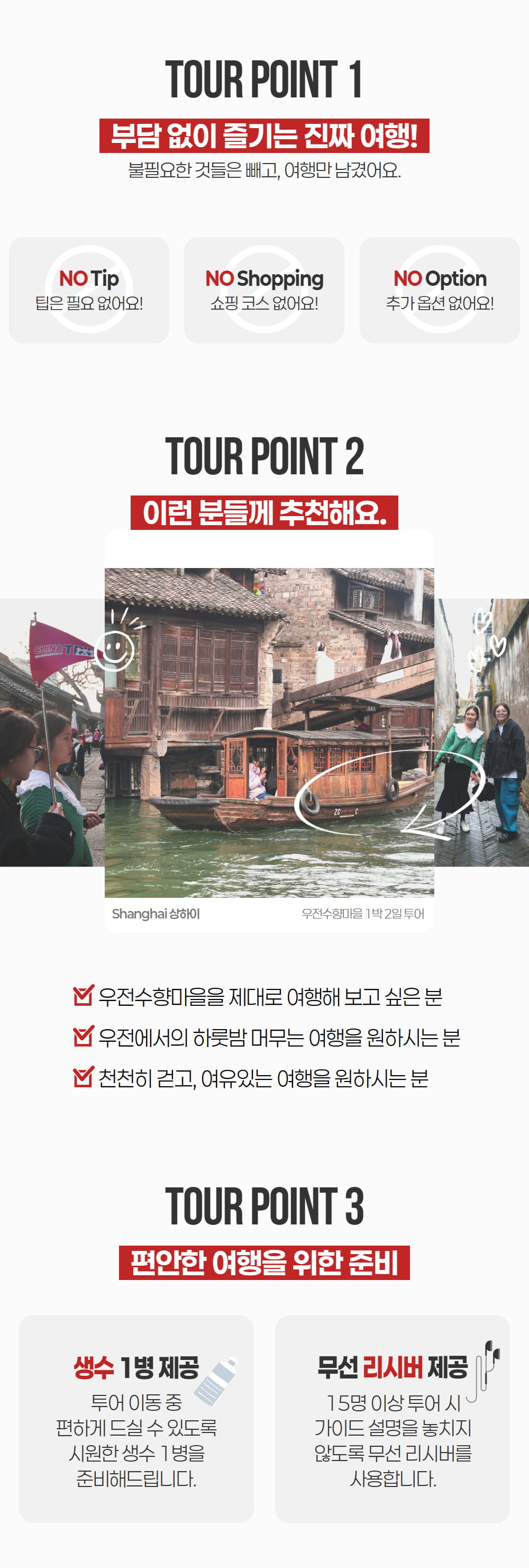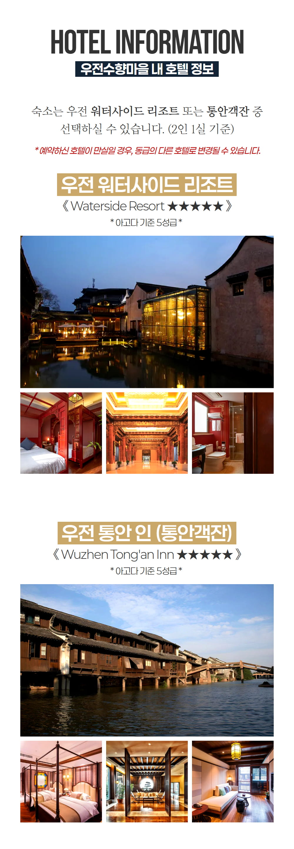 동책에서는 우전의 전통적인 옛 모습을, 서책에서는 조용해진 골목과 물길 위에 비치는 밤 풍경을 만나며 데이투어와 동일한 관광을 충분히 즐겨보세요. 우전에서 하룻밤을 보내며 여유로운 시간을 보낼 수 있고, 한국어 가이드 동행과 5성급 리조트 숙박이 포함되어 이동과 일정 걱정 없이 편안하게 상하이 대표 수향마을을 여행할 수 있답니다.