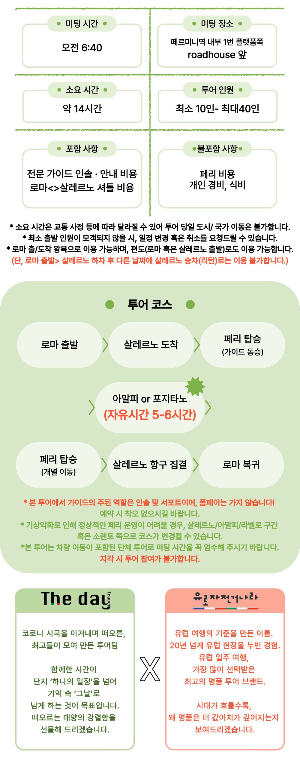 폼페이를 가지 않는 대신 남부에서 자유시간을 길게 드리고 아말피 또는 포지타노에서 5~6시간의 넉넉한 자유시간을 드려요. 추천해드리는 3가지 코스 중 원하는 동선을 선택해 개별적으로 둘러볼 수 있는 점이 가장 큰 매력이에요. 살레르노까지 이동 후 페리를 타고 해안을 따라 들어가기 때문에, 바다 위에서 감상하는 아말피 해안의 절경까지 함께 경험할 수 있어요. 가이드는 전 일정 설명 위주가 아닌 인솔과 안내 역할을 맡아 이동을 도와드리고, 맛집 추천과 동선 안내 등 실질적인 정보는 충분히 제공해드려 자유여행의 장점은 살리고 부담은 줄여드려요. 하루 14시간 동안 알차게 남부 이탈리아를 경험하고 저녁에 로마로 복귀하는 효율적인 일정이에요.