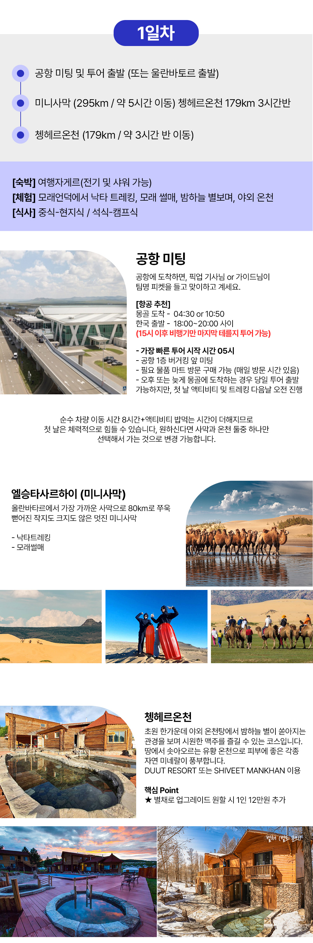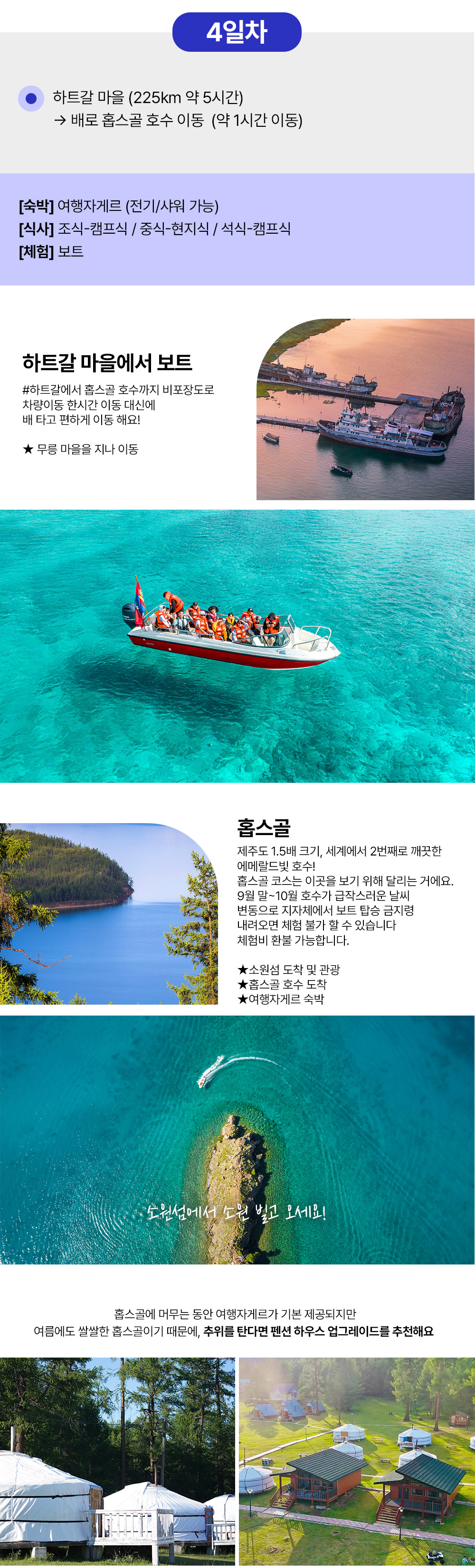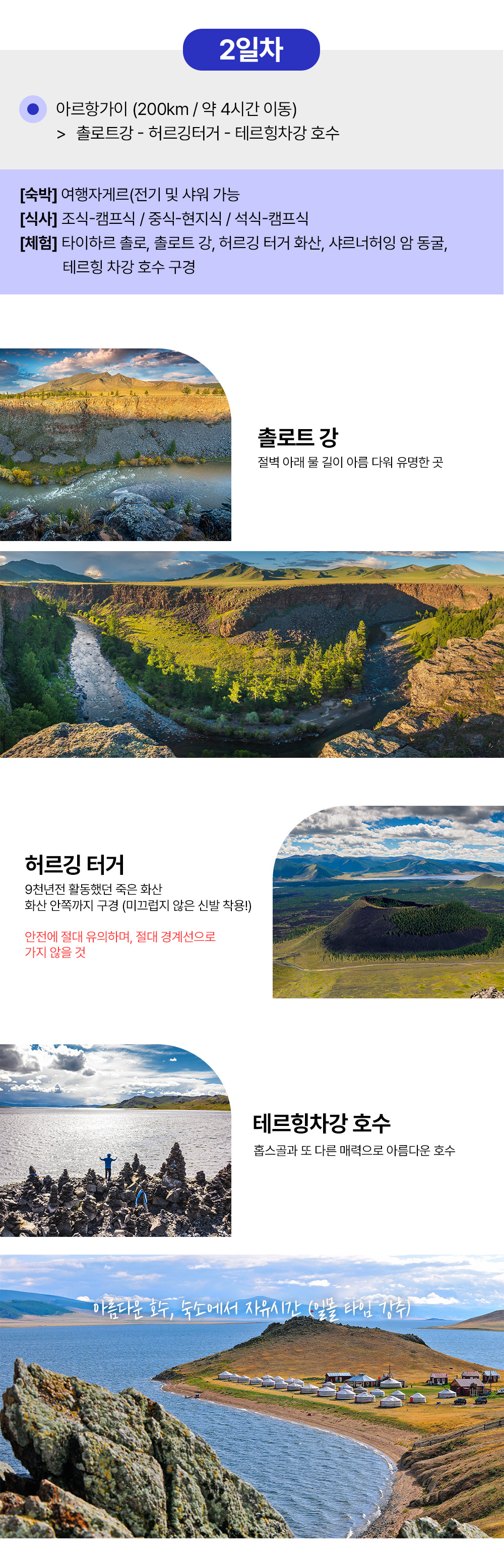 이 투어에서는 울란바토르에서 가장 가까운 미니사막 지대인 엘승타사르하이와 푸른 진주라는 별명을 가진 홉스골 호수를 방문해요. 쳉헤르온천에서 별을 감상하며 야외 온천욕을 즐길 수 있다는 점이 이 투어의 가장 큰 매력포인트에요! 단독 차량과 숙박, 식사가 포함되어 있어 편리하고 편안한 여행을 즐길 수 있어요. 매일 제공되는 맛있는 식사와 안전하고 쾌적한 숙소에서의 휴식 시간과 함께 몽골 여행을 더욱 특별하게 만들어 보세요!