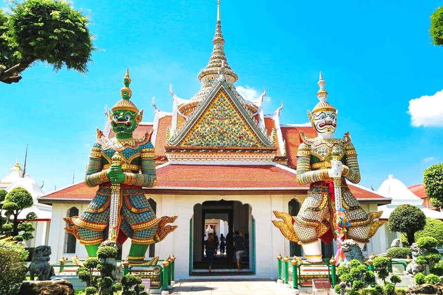 새벽 햇살을 받아 반짝이는 도자기 조각들이 신비로운 분위기를 자아냅니다. 강 건너편에서 바라보는 전경은 방콕 여행객들이 꼽는 최고의 포토 스팟이죠. 강바람을 맞으며 태국에서 가장 아름다운 사원의 실루엣을 담아보세요.