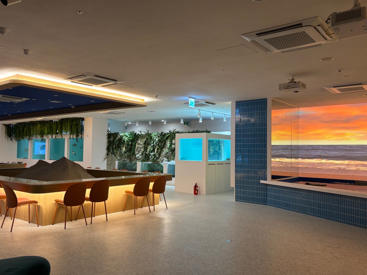 대구 도심에서 만나는 이색 아쿠아 테마 카페로, 수족관을 감상하며 여유로운 시간을 보낼 수 있는 특별한 공간입니다. 은빛 물고기들이 유영하는 대형 수조를 가까이에서 바라보며 커피와 음료를 즐길 수 있어 마치 작은 해양 세계 속에 들어온 듯한 분위기를 느낄 수 있습니다. 물고기뿐만 아니라 앵무새, 거북이 등 다양한 동물들을 가까이에서 만나볼 수 있어 아이들에게는 즐거운 자연 체험 공간이 되고, 연인과 친구들에게는 색다른 데이트 장소가 됩니다. 도심 속에서 잠시 일상을 벗어나 바다의 분위기와 생명의 움직임을 함께 느낄 수 있는 특별한 힐링 공간입니다.
