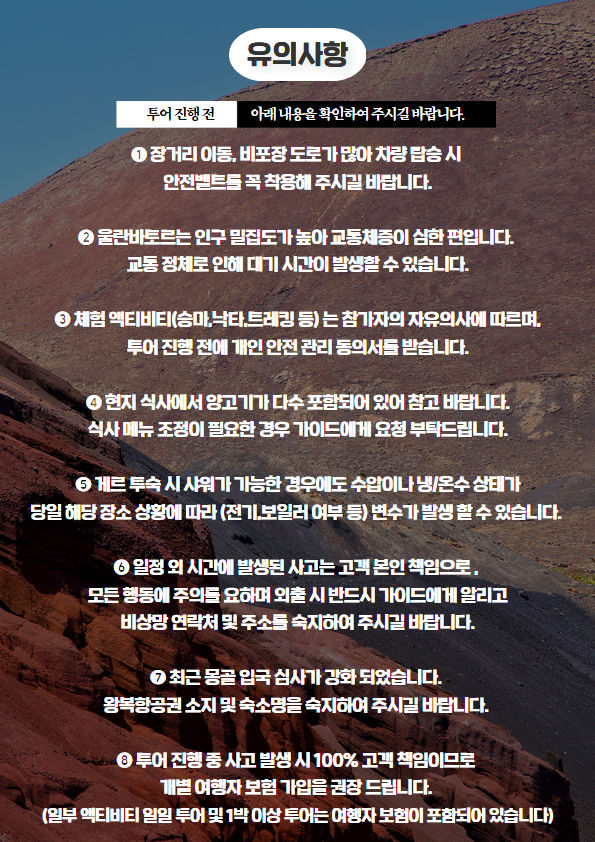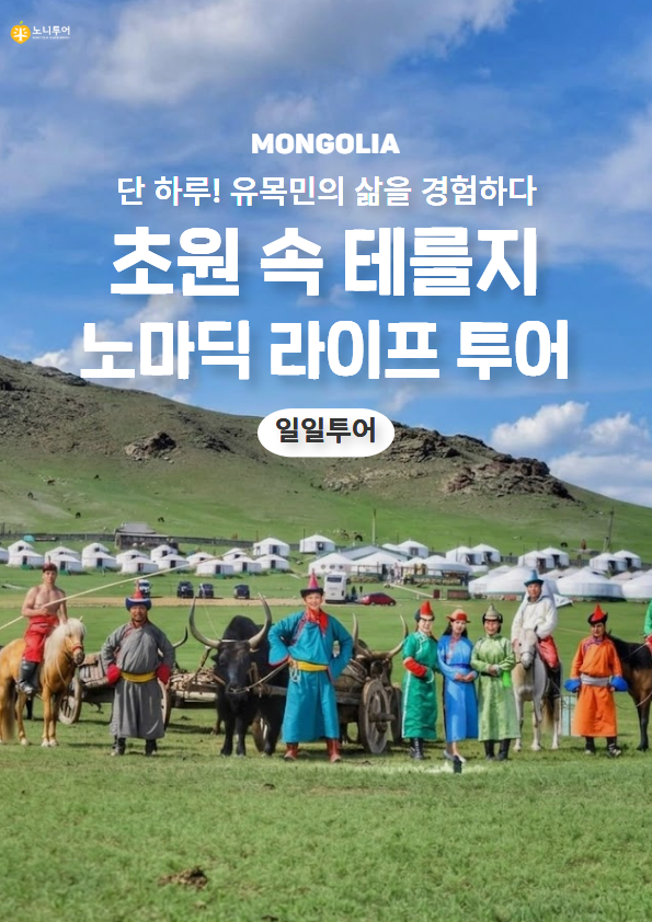도시의 소음에서 벗어나 말의 발자국 소리와 바람의 숨소리만 가득한 이곳에서 진정한 몽골을 마주해 보세요. 100년 된 구옥이 주는 편안함처럼, 수천 년을 이어온 유목민의 전통 게르와 그들의 따뜻한 환대가 여러분을 기다립니다. 웅장한 거북바위와 아리야발 사원의 고요함 속에서 어지러웠던 마음을 정리하고, 끝없이 펼쳐진 지평선을 바라보며 어린 시절 꿈꾸었던 모험가가 되어볼 수 있습니다.