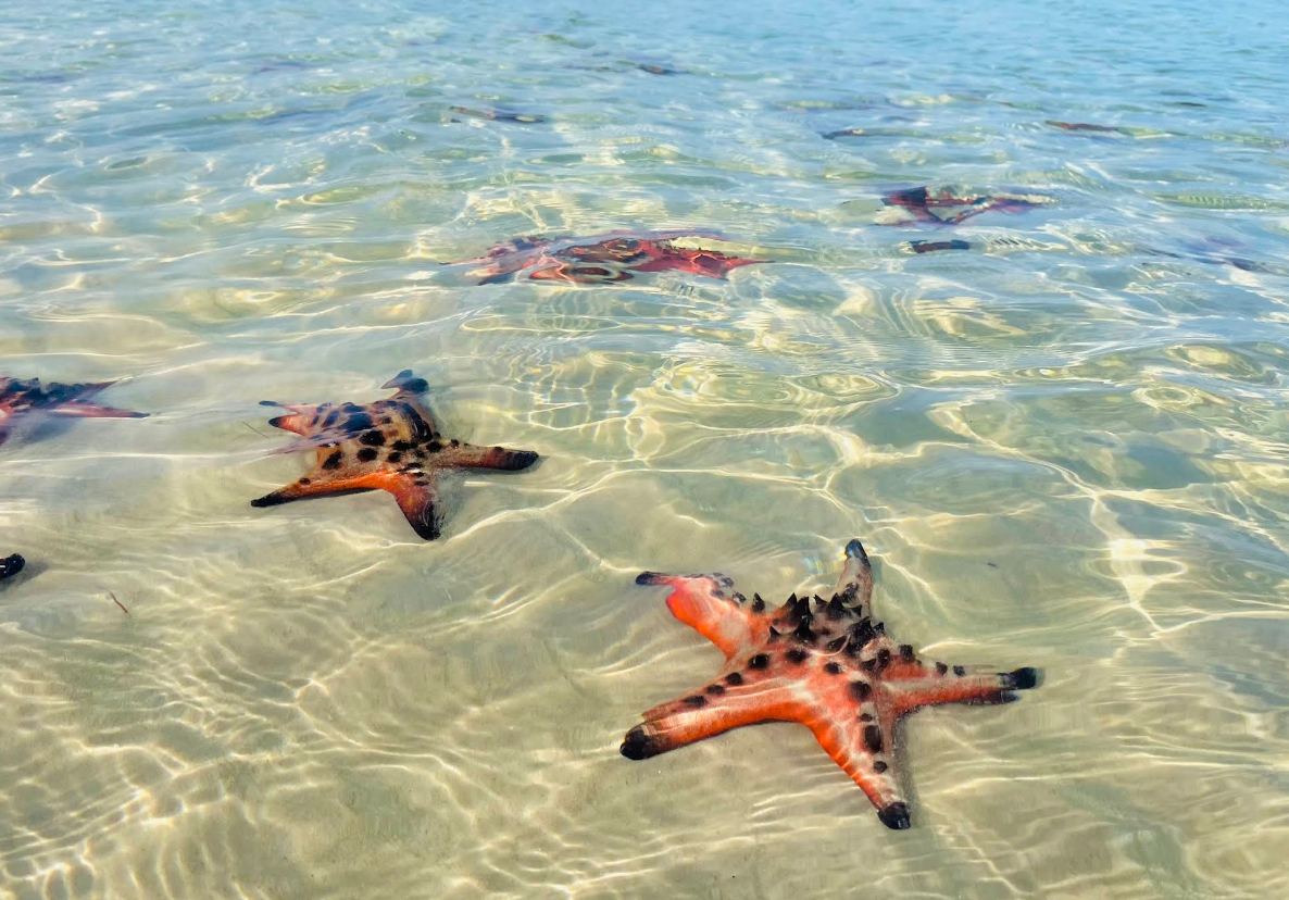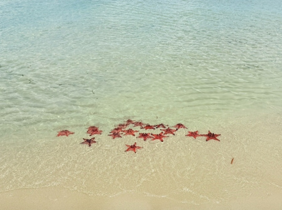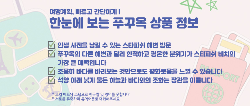 푸꾸옥 북쪽 끝, 투명한 바다 위로 붉은 별들이 흩뿌려진 동화 같은 풍경. '스타피쉬 비치'로 여러분을 초대합니다.