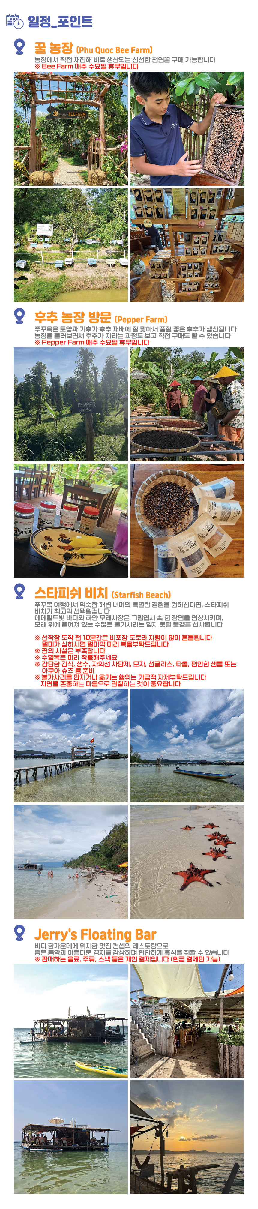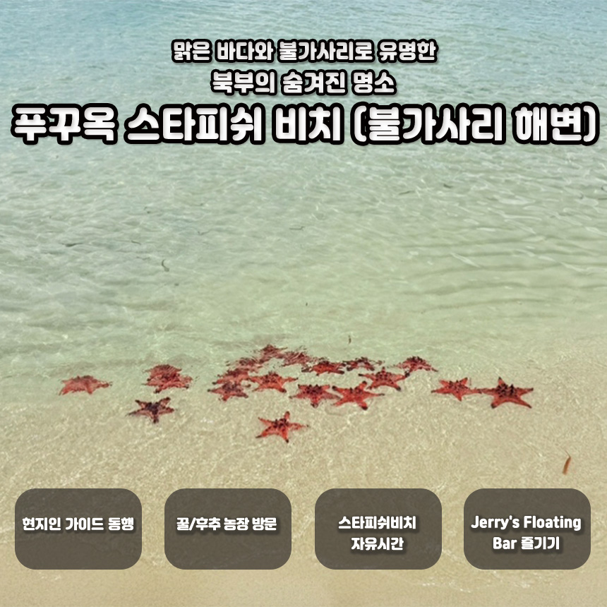 현지인 가이드와 함께 달콤한 꿀 농장과 알싸한 후추 농장을 차례로 거치며 대지의 생명력을 느끼고, 여정의 하이라이트인 불가사리 해변에 닿습니다. 잔잔한 물결 속 붉은 별들과 인생 사진을 남긴 후, 바다 위 낭만적인 'Jerry’s Floating Bar'에서 시원한 음료 한 잔의 여유를 즐겨보세요. 일상의 소음이 사라지고 오직 파도 소리만 남는 곳, 진짜 푸꾸옥의 얼굴을 마주할 시간입니다.