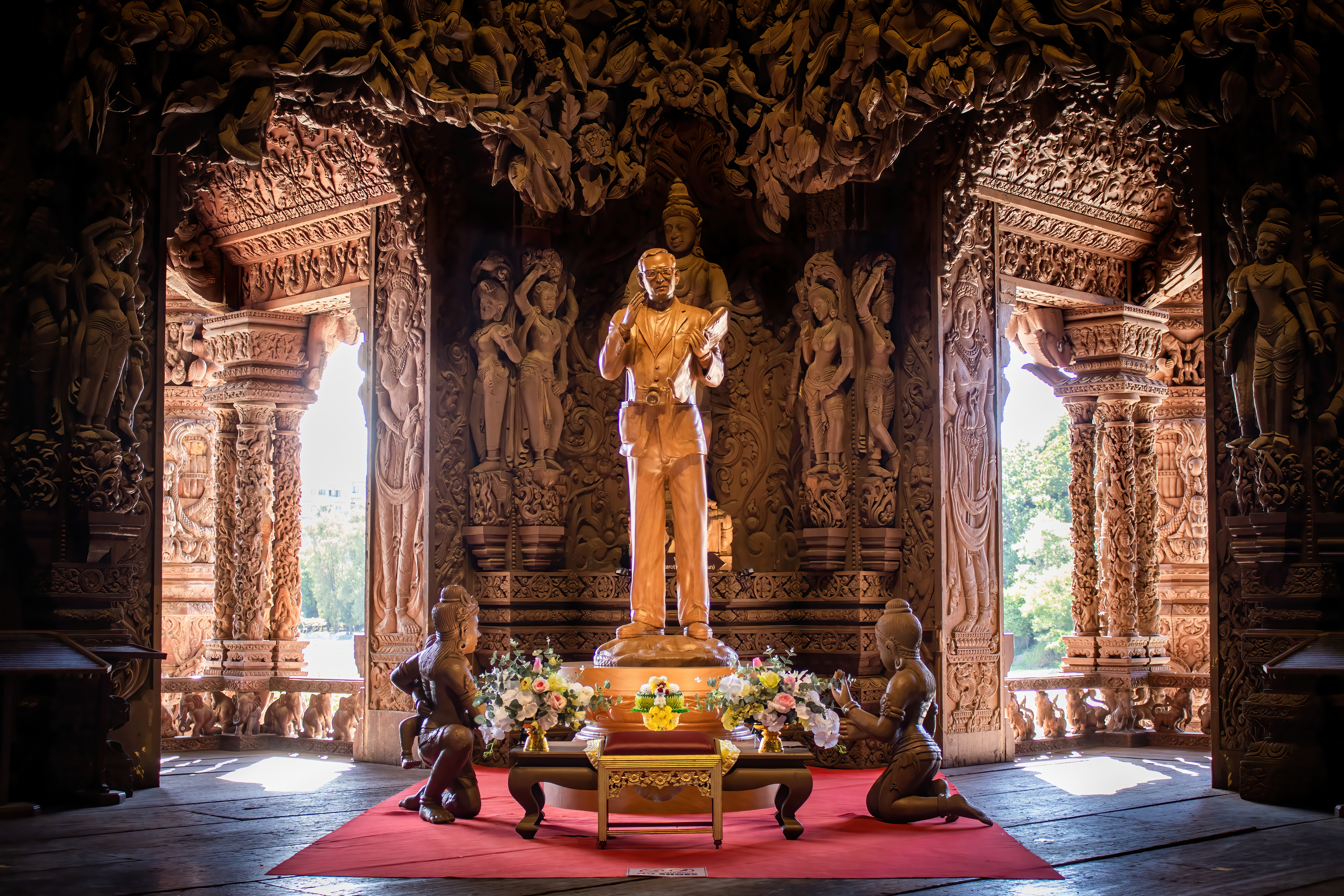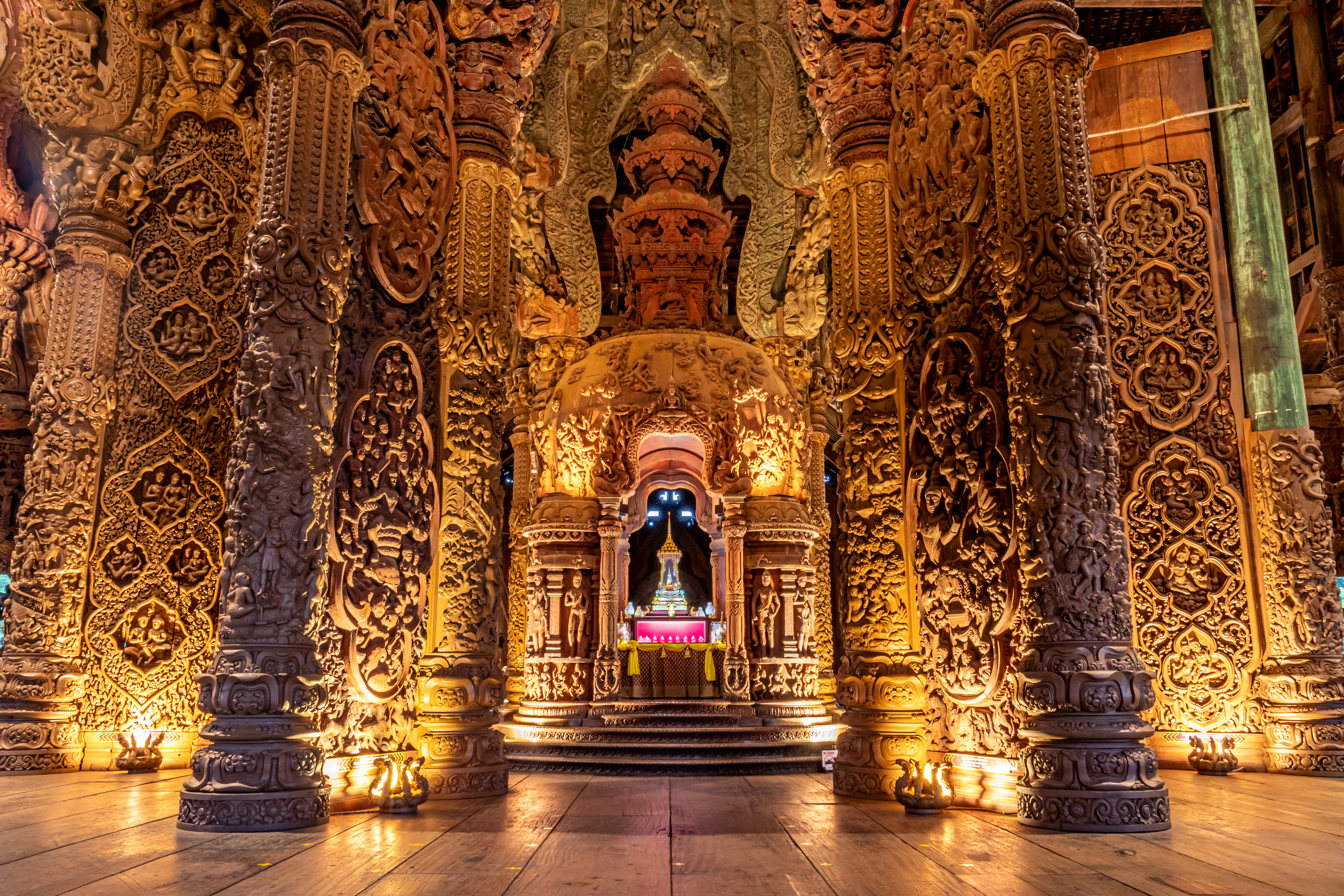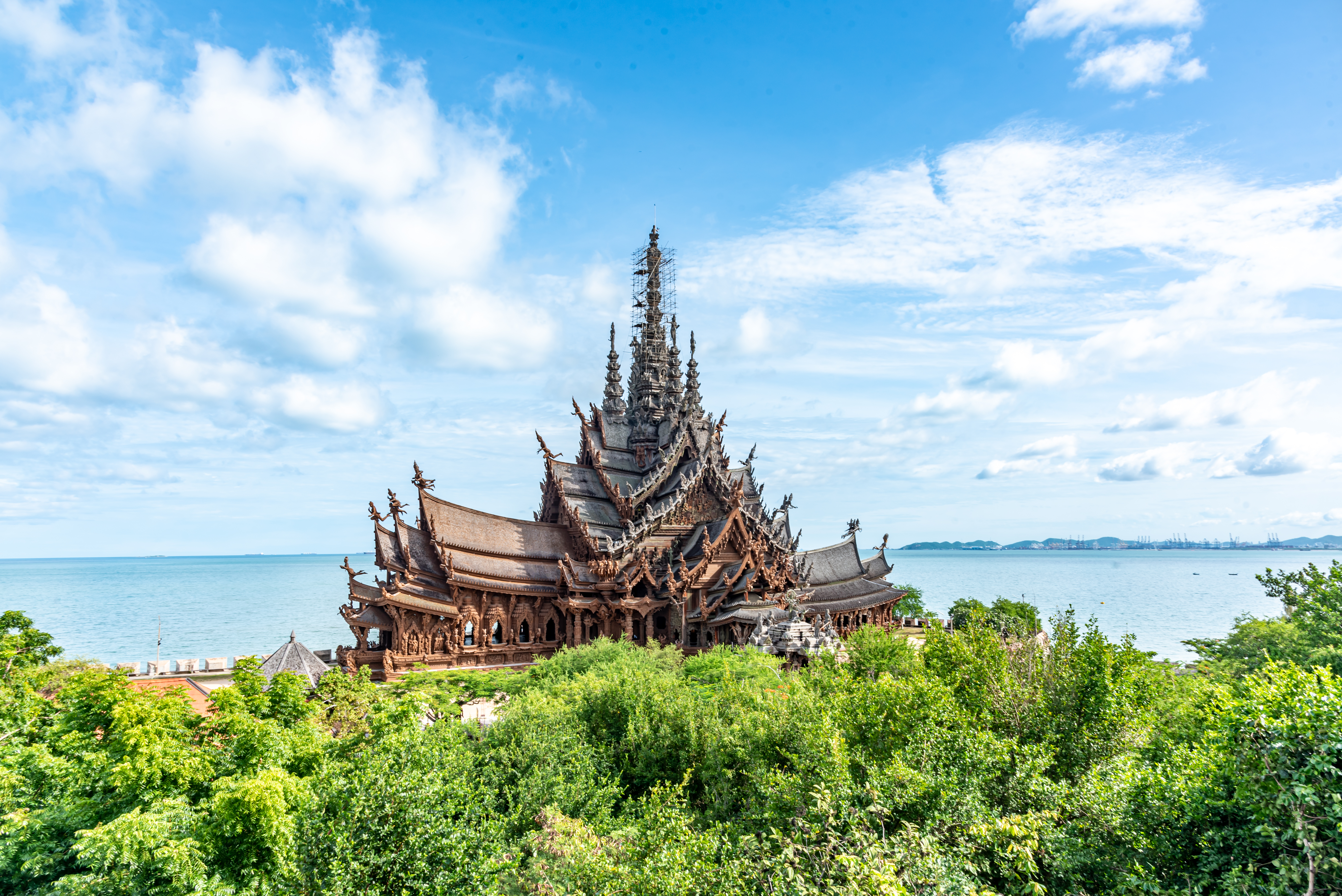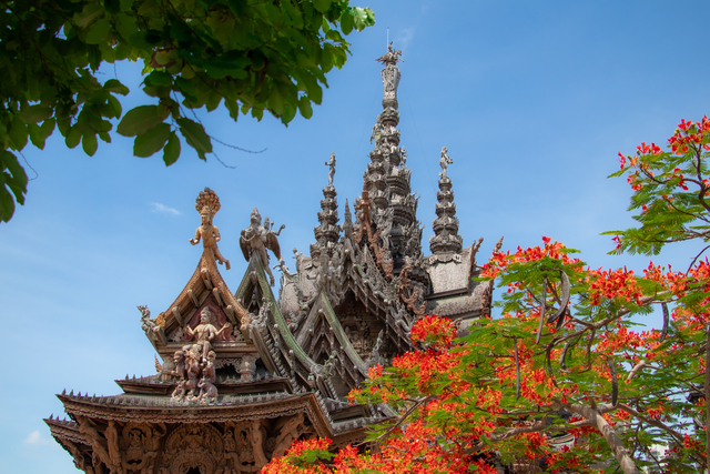 못 하나 없이 오직 전통 목재 결합 방식으로 완성된 세계 최대 규모의 목조 건축물로, 인간의 기술과 장인 정신이 만들어낸 압도적인 스케일을 직접 느낄 수 있는 것이 가장 큰 매력입니다. 성전의 외벽과 내부를 가득 채운 정교한 조각들은 동양 철학과 종교, 우주의 질서를 담고 있어 단순한 관광지를 넘어 예술과 사상을 함께 경험할 수 있으며, 바다 위에 세워진 독특한 입지로 파타야 해안과 어우러진 장관을 감상할 수 있습니다. 1981년부터 현재까지 계속해서 완성되어가는 ‘미완의 건축물’이라는 점 또한 특별한 의미를 더하며, 나무 향과 바닷바람이 어우러진 공간 속에서 다른 곳에서는 느낄 수 없는 신비롭고 깊이 있는 경험을 제공합니다.