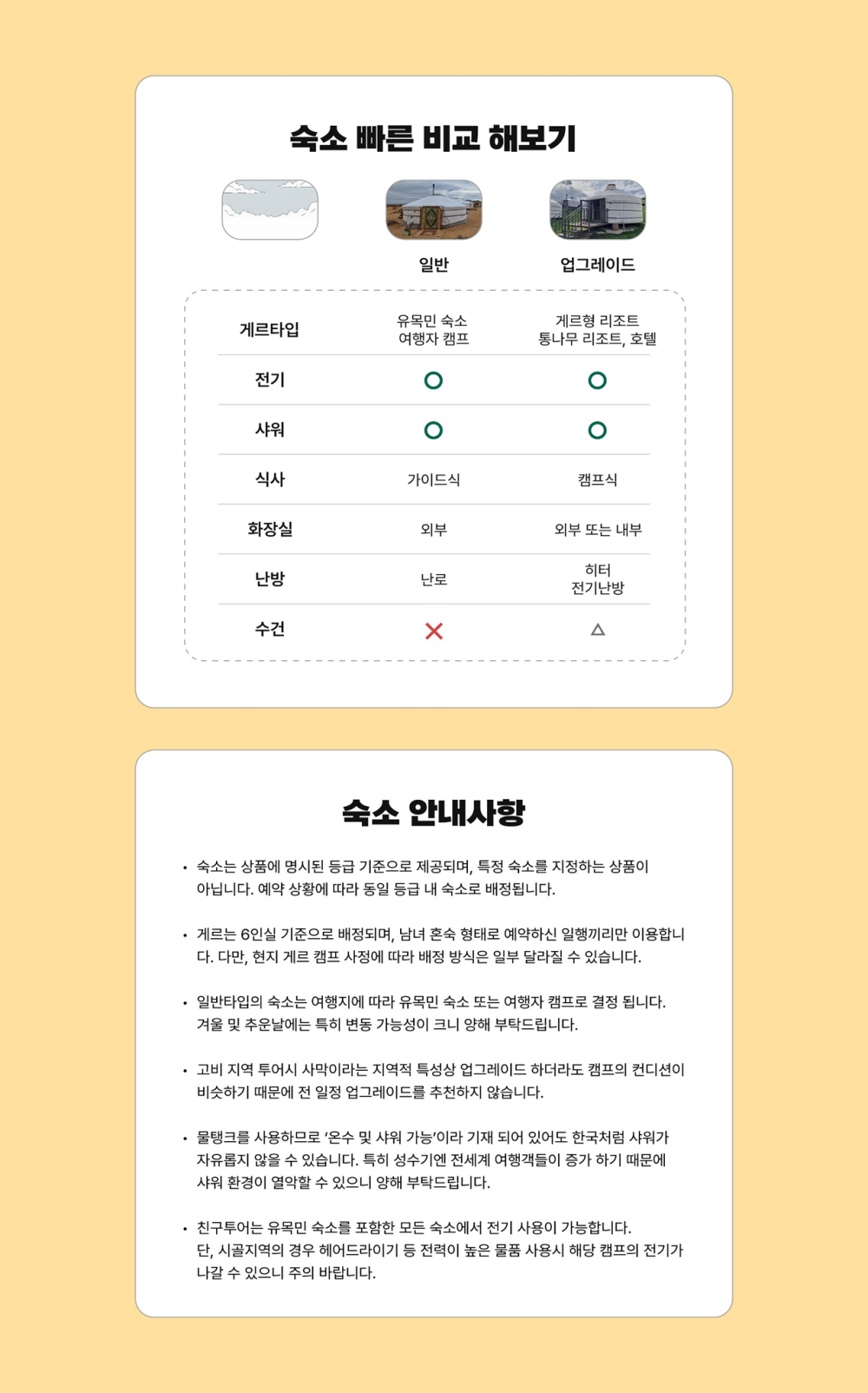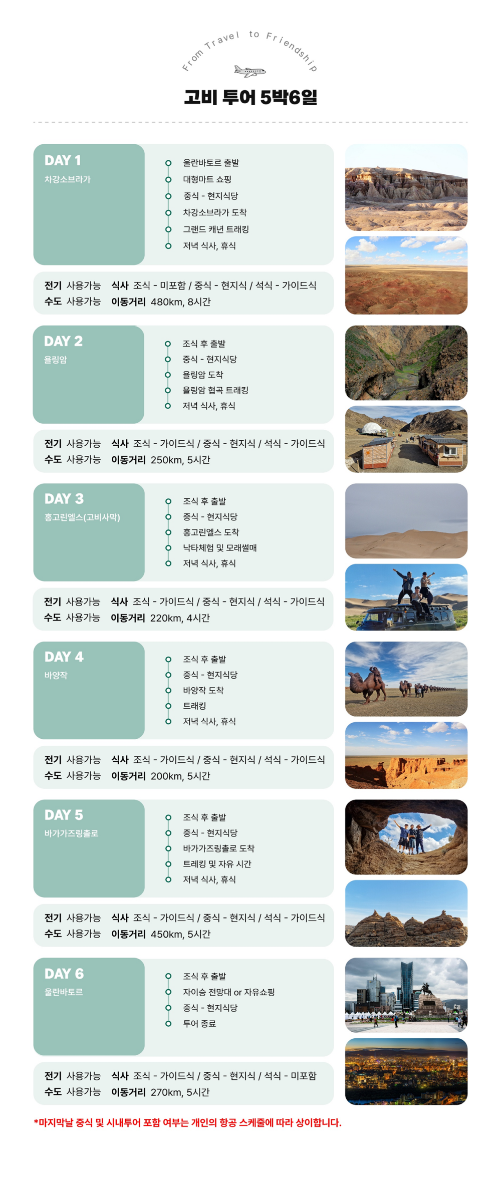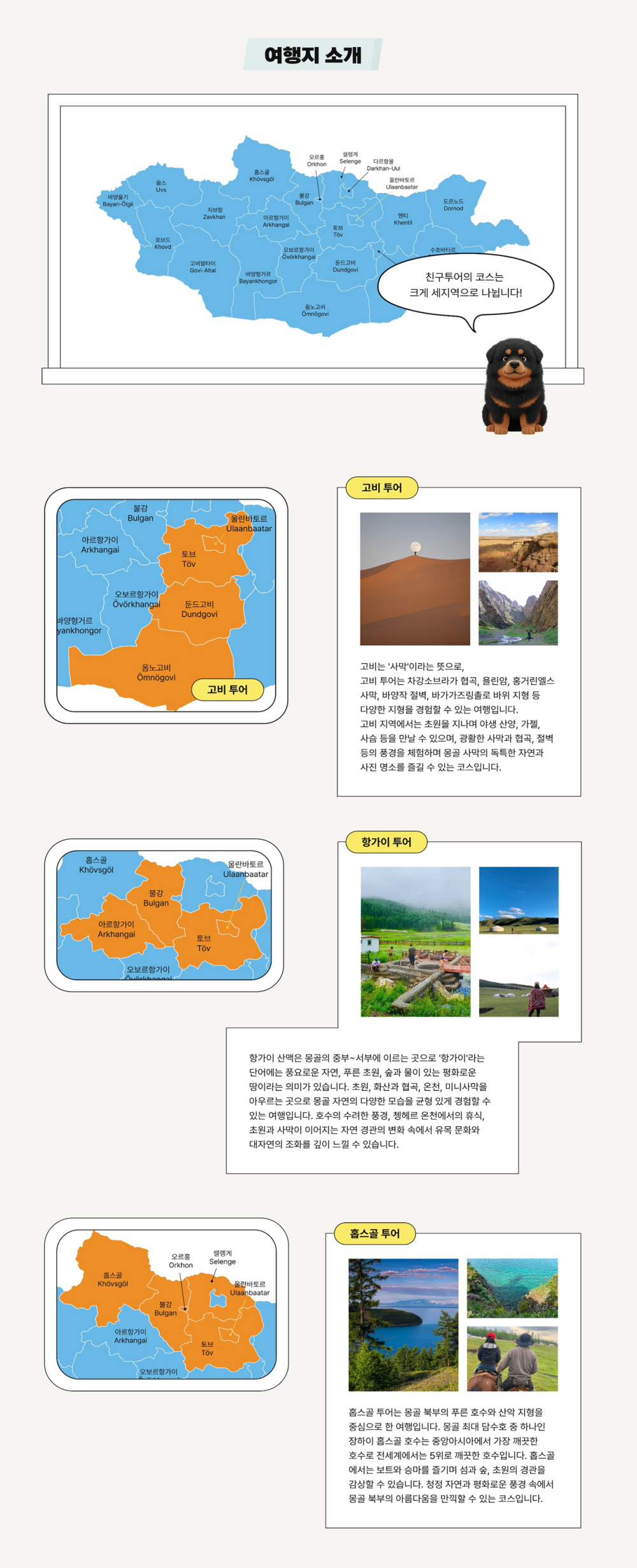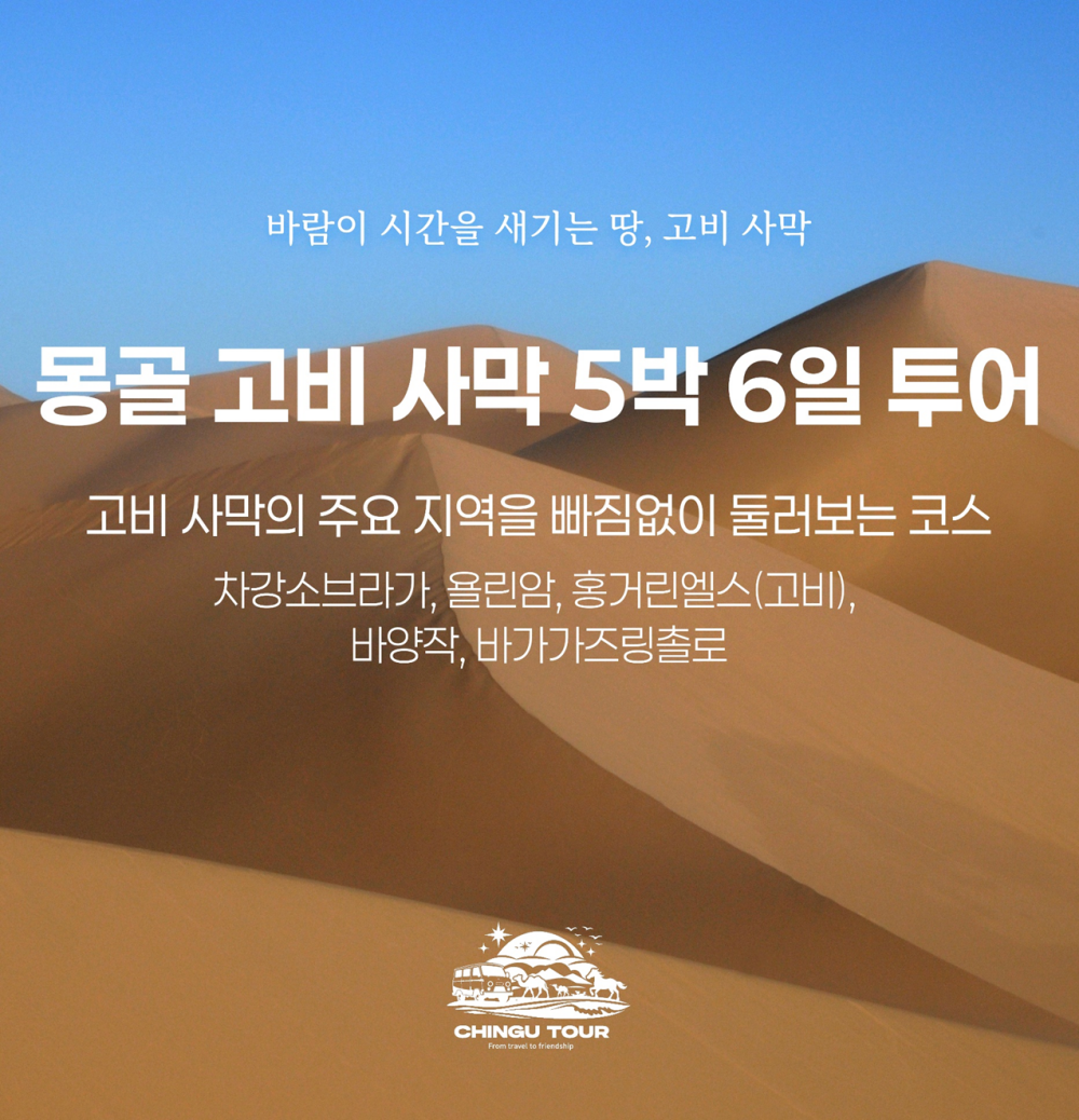 한국어 제공몽골 남부 고비 지역의 대표 명소들을 5박 6일 동안 깊이 있게 탐방하는 사막투어를 소개해요.